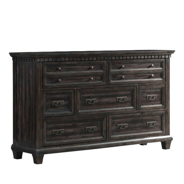 The Morrison 7-Drawer Dresser features two hidden drawers to keep your most precious valuables safe! Elegant oil rubbed bronze finished knobs and pulls pair nicely with the beautiful smokey walnut finished wood. This horizontal dresser comes with seven, spacious drawers; perfect for keeping all of your belongings neatly in one place. Dust proofing on the bottom drawers help protect your belongings. Dental molding and bevel edges complete the look of this transitional design.