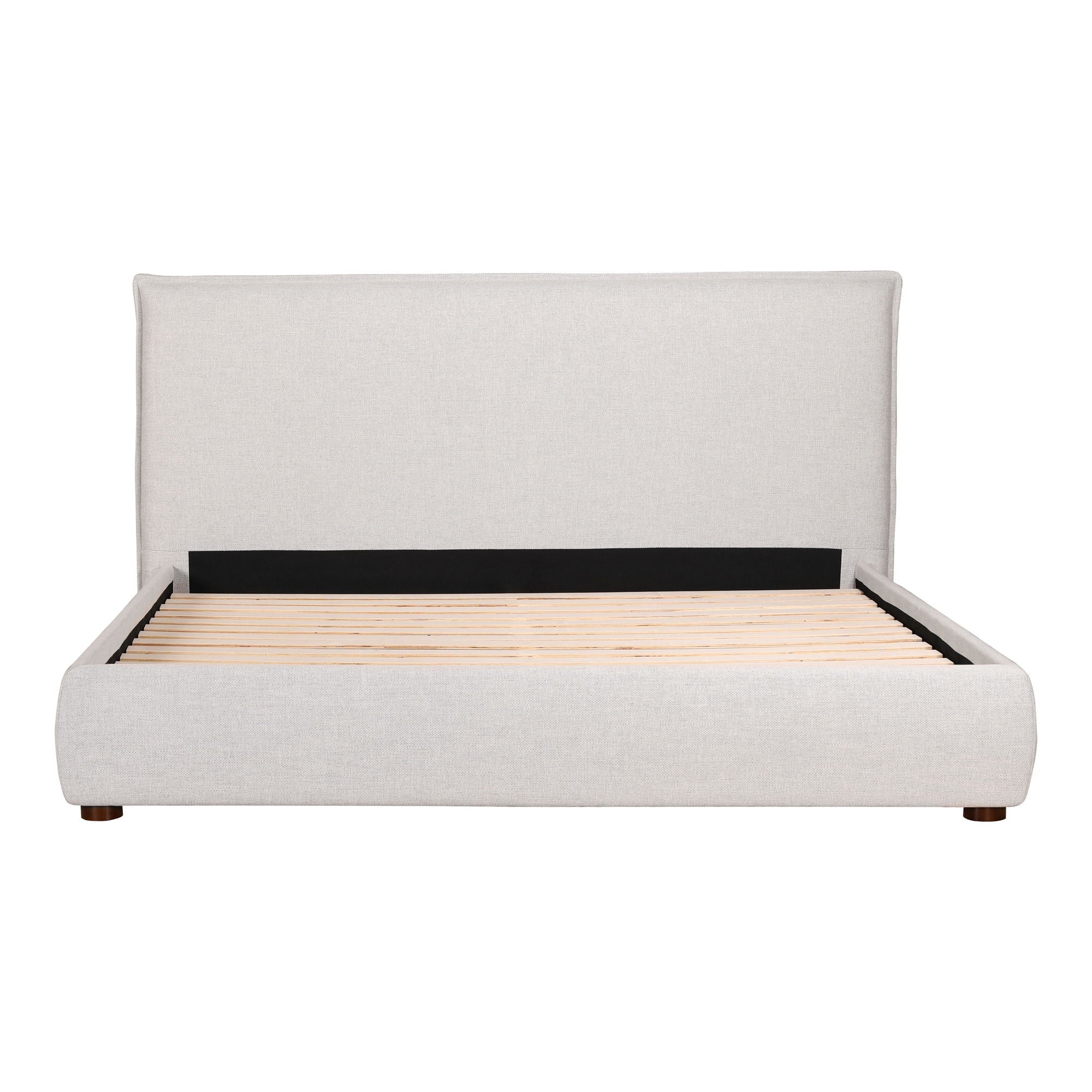 - Soft, fabric upholstery with foam padded headboard featuring flanged edges. Subtle wooden, cylindrical legs