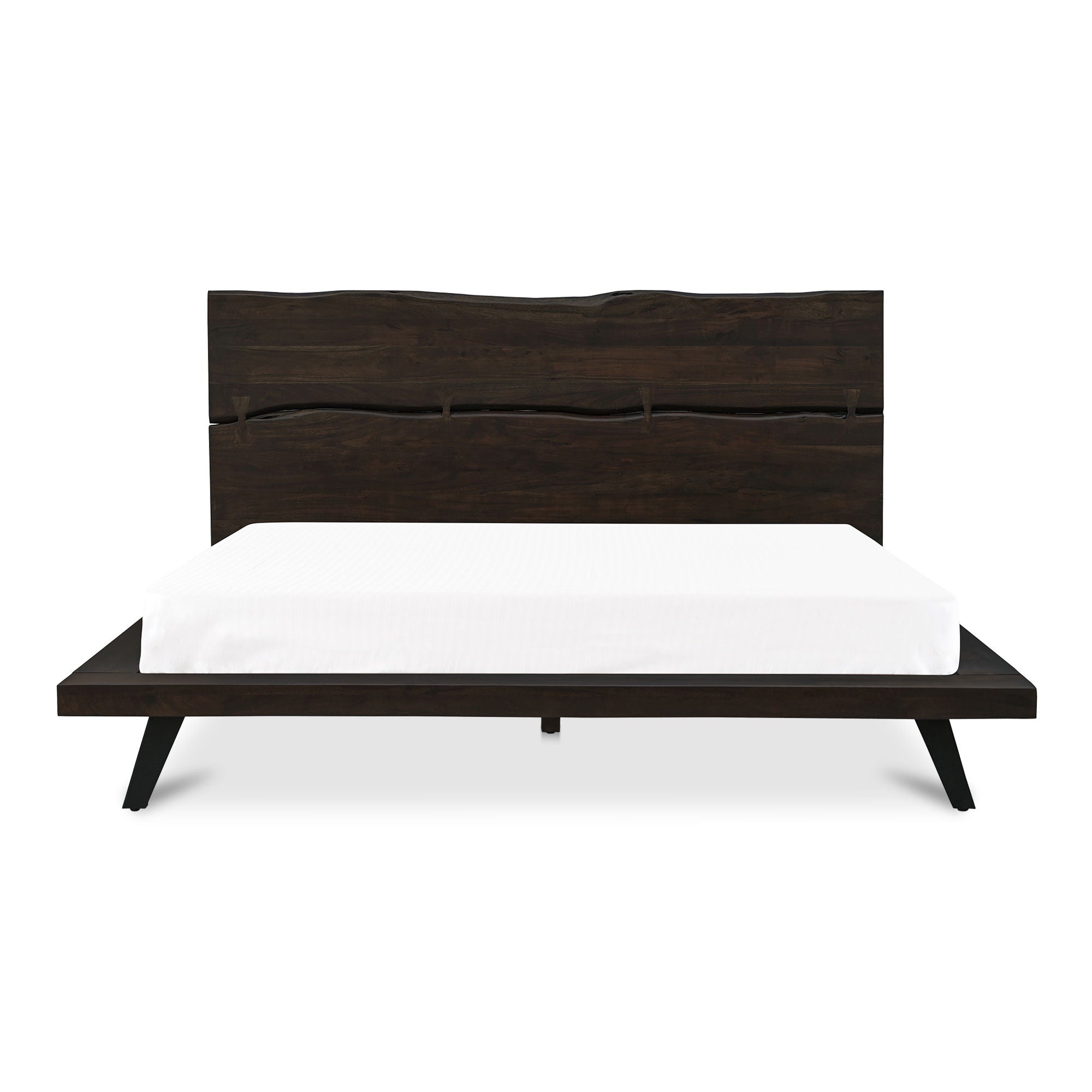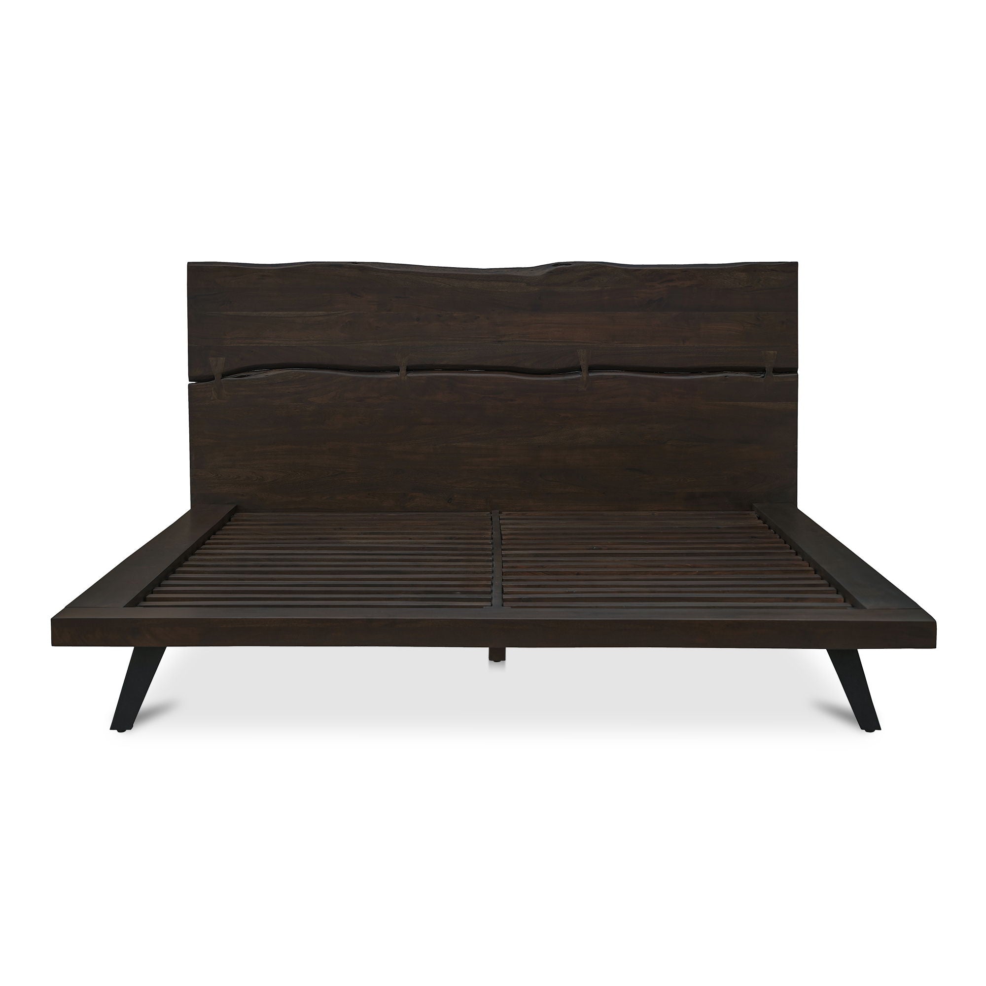 - Solid Acacia wood frame with angular, powder-coated steel legs. Organic edge headboard with butterfly joinery