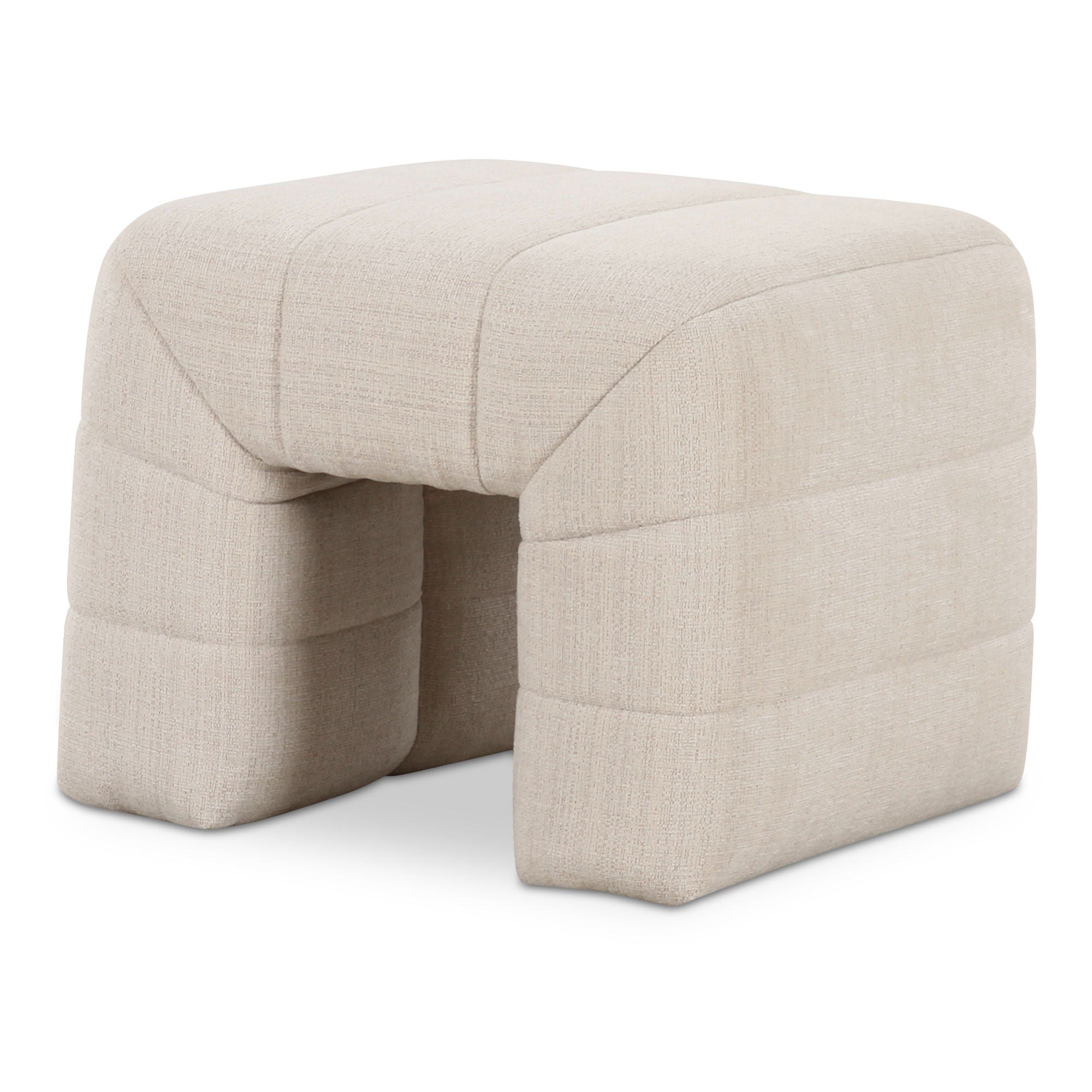 The Verity stool features a plump form enveloped in soft, flecked textured upholstery with warm tones for a touch of elegance. Wide channel detailing adds texture and visual interest, complemented by rich, warm tones that tell a story of comfort and coziness as the high-density foam seat provides a plush seating experience.
