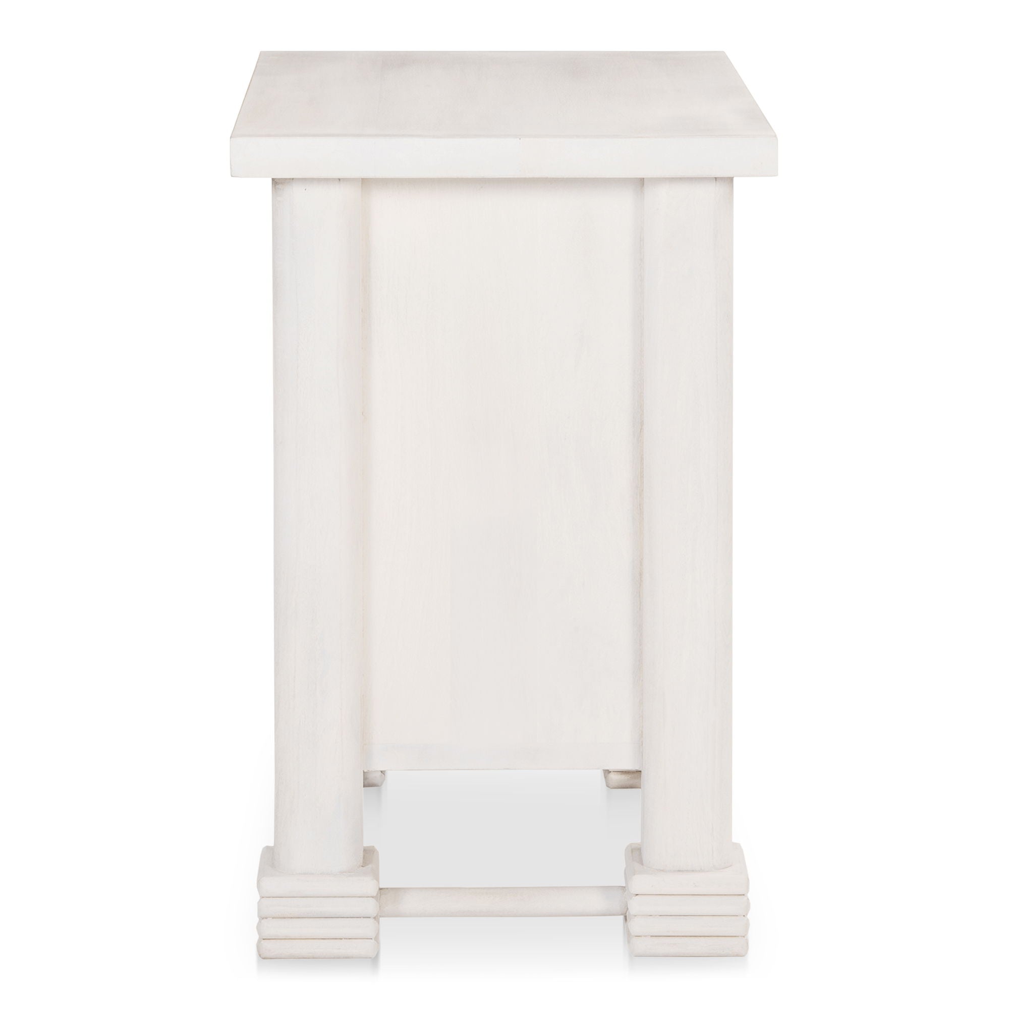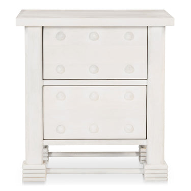French-inspired elements and circular motifs enrich the Clement nightstand's oversized, chunky design. Crafted from mango wood with a whitewash finish, this ornate piece features carved detail feet with stretcher bars and drawer storage.