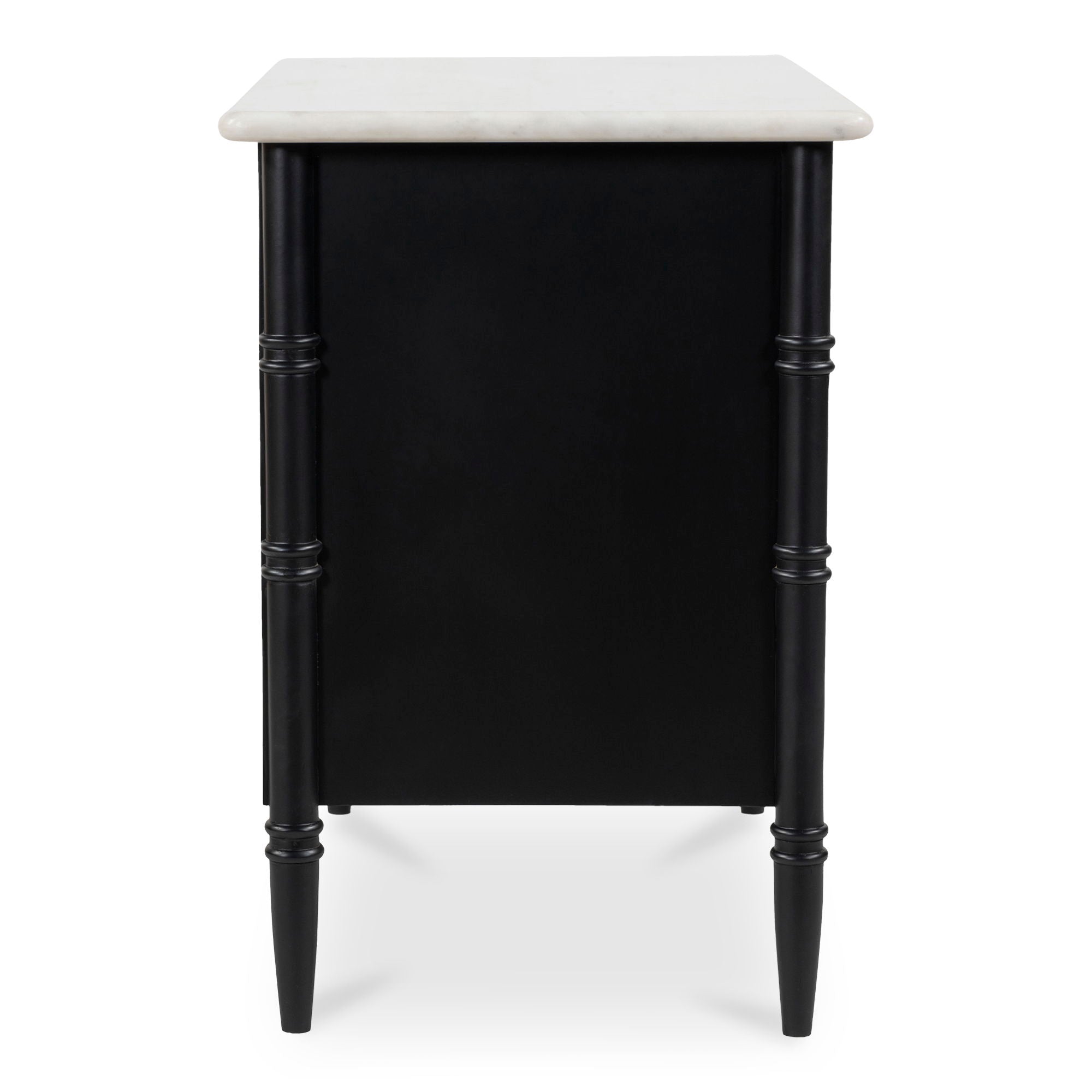 Inspired by the everyday grace of Provence style, the Eleanor nightstand showcases a classically graceful profile with distinctive turned details. Crafted from Mango wood, this piece is crowned with an expressive marble top and finished with solid antique finished brass finish handles, adding a touch of timeless sophistication and natural beauty.