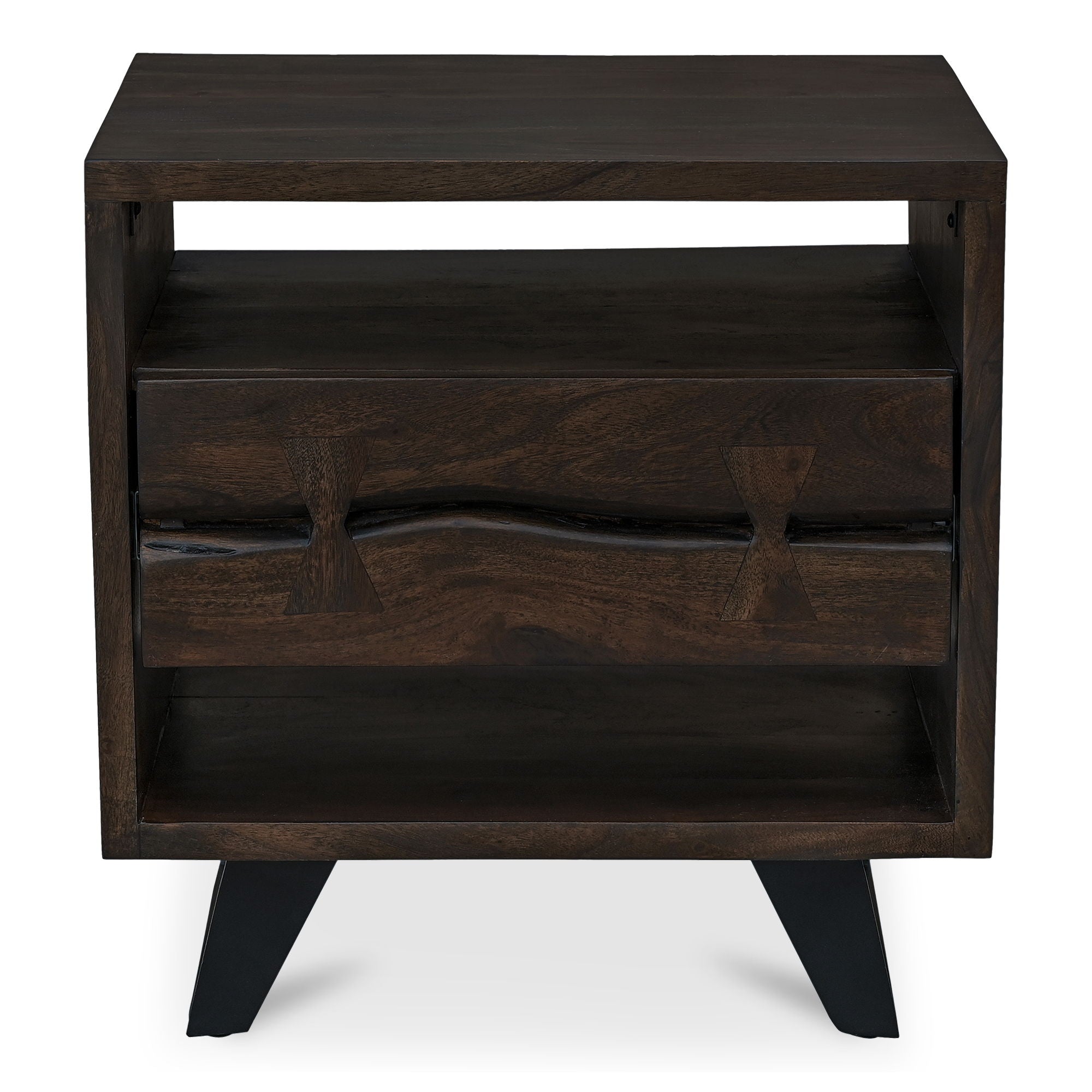 Crafted from solid Acacia wood and supported by geometric steel legs, the Madagascar nightstand offers an aesthetically pleasing rugged appeal blending rustic and industrial design. Thoughtfully designed with a single drawer between two open spaces to cater to bedside essentials, this piece is both practical and visually captivating.