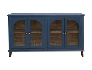 Consola de 4 puertas de vidrio. Las consolas Genova, elaboradas con madera de pino y okume ligeramente envejecida, ofrecen un toque contemporáneo a la estética de mediados de siglo, con colores vibrantes ideales para complementar espacios monocromáticos o añadir un toque de viveza. Sin duda, serán el centro de atención en cualquier habitación.