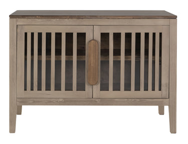 La consola presenta un diseño bien pensado, que incluye un estante fijo para un almacenamiento práctico; esto le permite mantener su espacio organizado mientras exhibe sus artículos decorativos. Las puertas de listones, equipadas con bisagras superpuestas y cierres magnéticos, garantizan un cierre seguro, combinando funcionalidad y estilo. Los tiradores de madera integrados, con un acabado cálido, realzan la estética general, mientras que el exclusivo diseño de la parte superior flotante le aporta un toque distintivo.