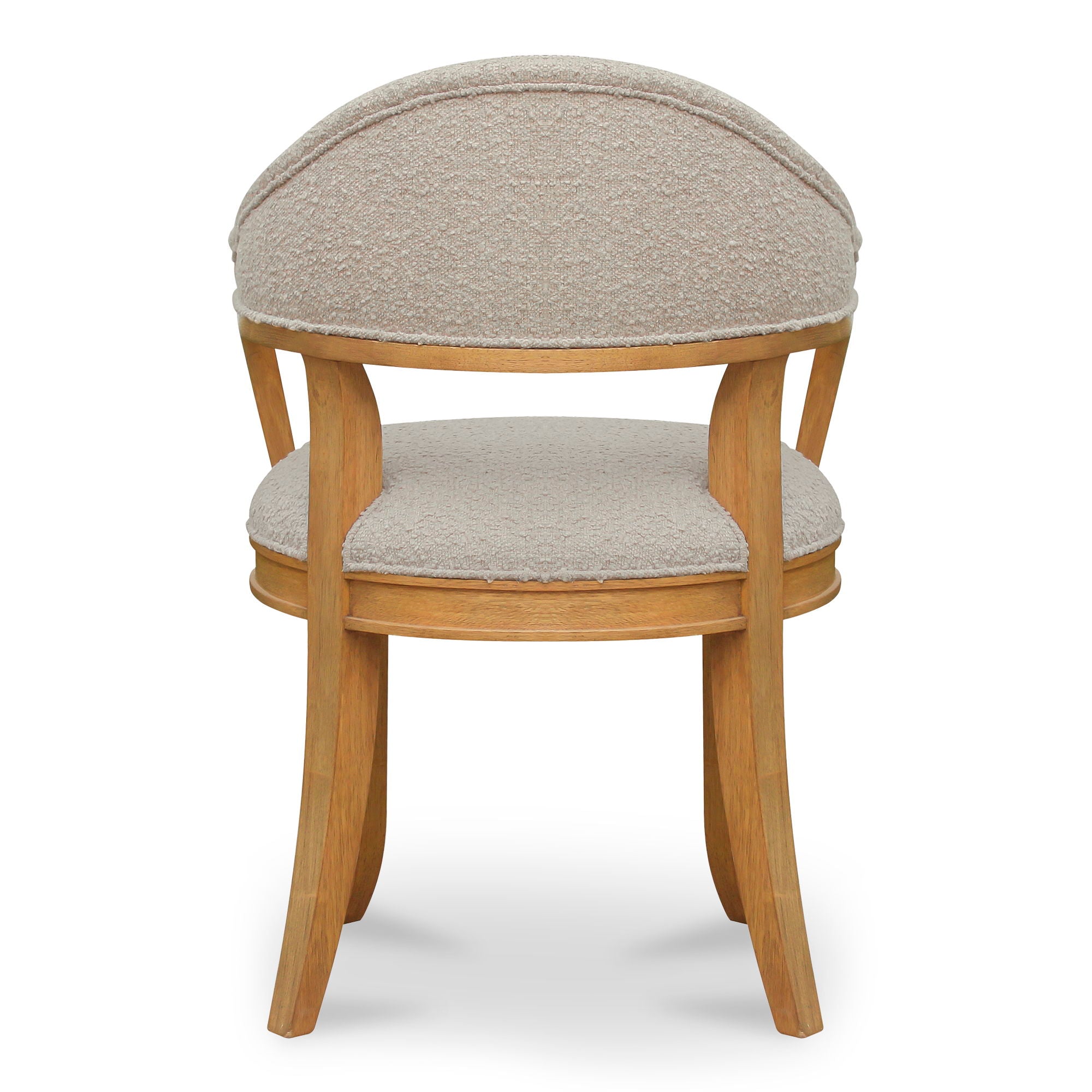 The Carlos dining chair's gracefully curved backrest and plush seat invite lingering conversations, while the wire-brushed rubberwood frame adds natural warmth as subtle flared legs add a touch of feminine grace, offering enduring comfort and sophistication.