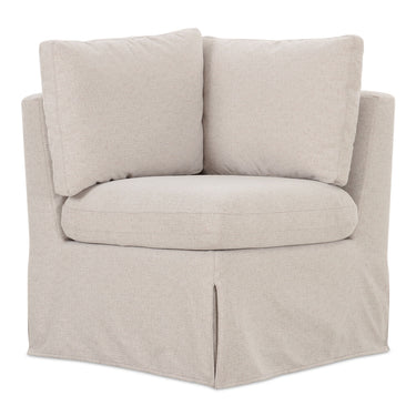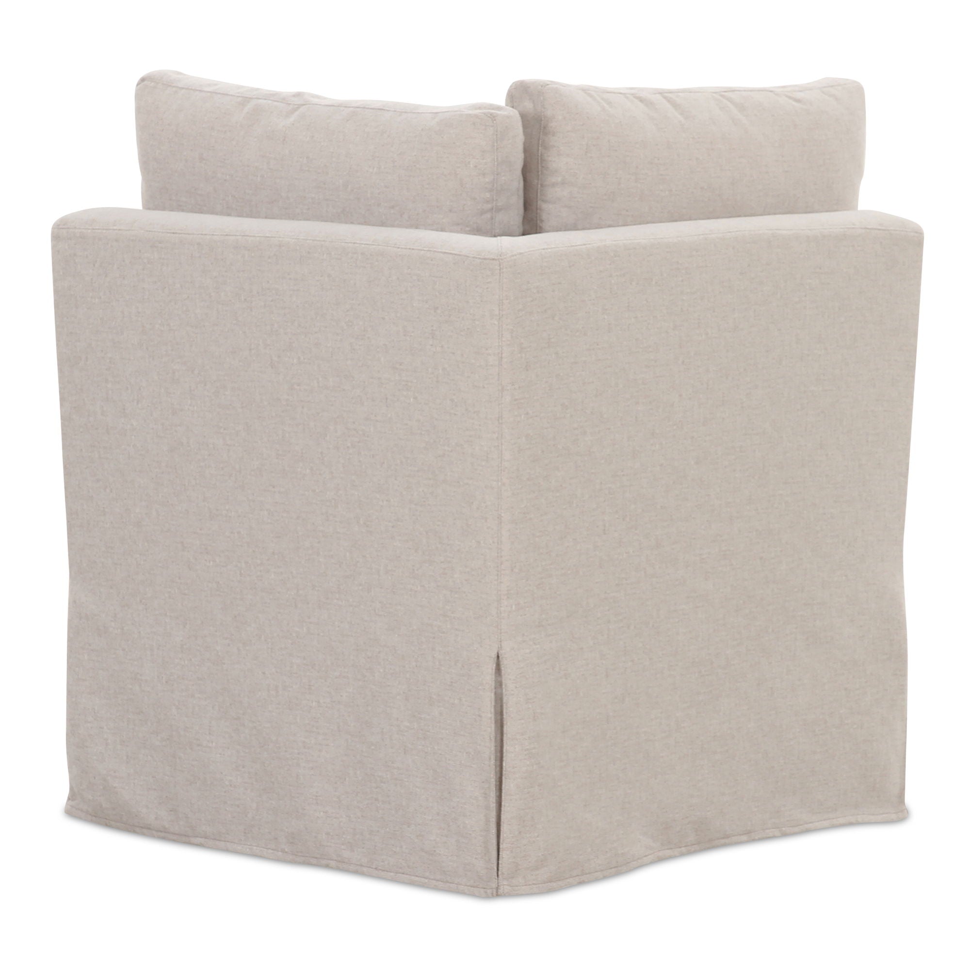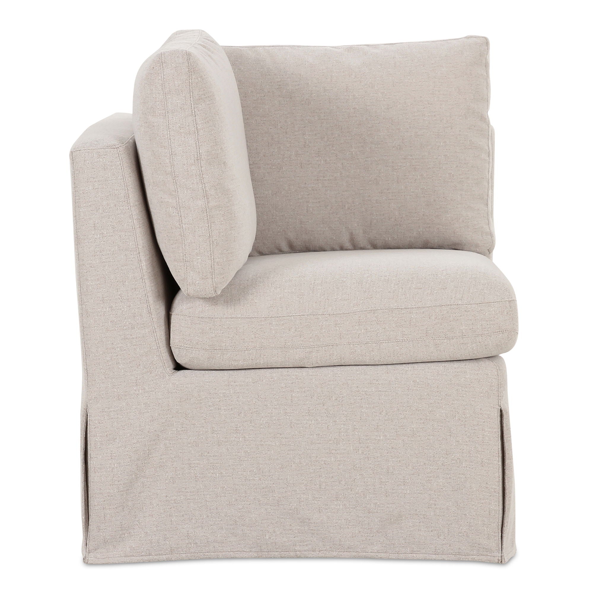 The Fable slipcover dining corner chair's snug-fitting, washable slipcover with inverted pleats offers a tidy appearance and effortless upkeep. A slight tilt encourages a relaxed seating posture with a pillow back and seat cushions for comfort. Designed to be modular, it includes alligator clips to connect with other pieces in the collection, adapting seamlessly to various dining table sizes.