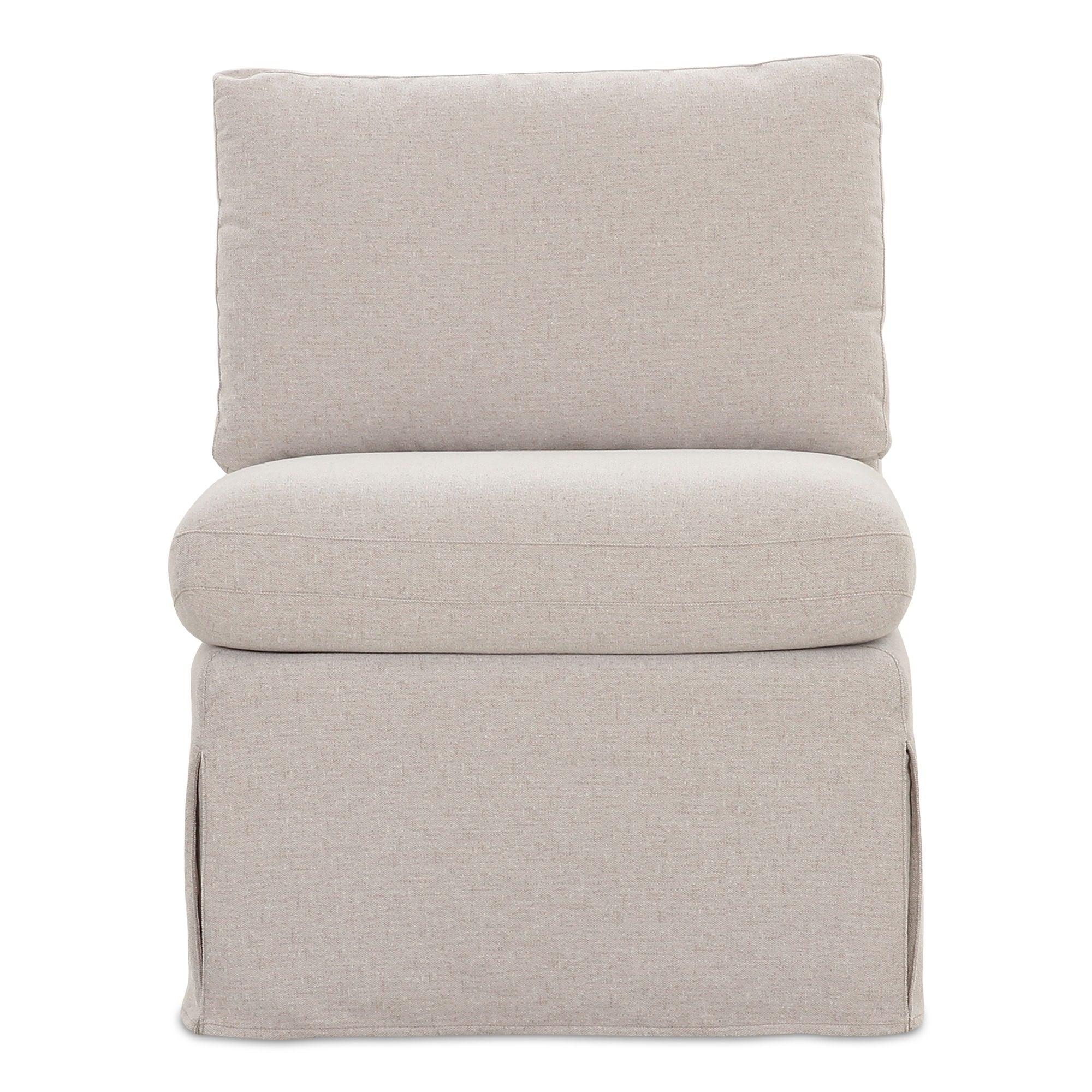 The Fable slipcover dining slipper chair's snug-fitting, washable slipcover with inverted pleats offers a tidy appearance and effortless upkeep. A slight tilt encourages a relaxed seating posture with a pillow back and seat cushions for comfort. Designed to be modular, it includes alligator clips to connect with other pieces in the collection, adapting seamlessly to various dining table sizes.