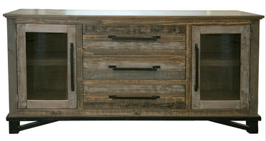 Aparador de 3 cajones y 2 puertas. La colección Loft Brown está fabricada con madera de pino teñida y envejecida a mano, complementada con herrajes de hierro forjado a mano. Esta hermosa colección ofrece una amplia gama de colores con acabados de alta y baja calidad, lo que la convierte en una adición impactante a cualquier decoración que elija.
