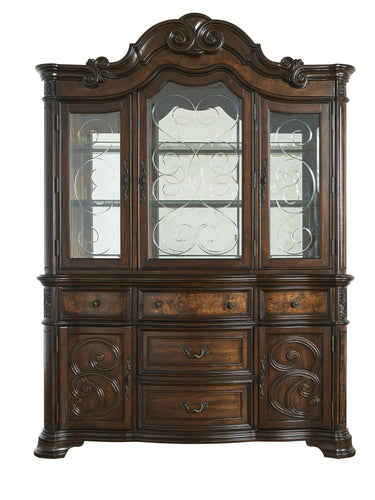Royale evoca recuerdos del detalle y la artesanía de las antigüedades de antaño en una colección de comedor actualizada para el presente. El aparador y aparador Royale luce un cálido acabado marrón nogal sobre chapas de roble y fresno, que combina con frentes y tapas moldeados para crear una presentación realmente majestuosa. El aparador ofrece amplio espacio de almacenamiento para su comedor con cinco cajones y dos gabinetes con estantes de vidrio e iluminación táctil en el aparador. El vidrio grabado y las volutas talladas completan la presentación para impresionar a su familia y amigos en cualquier reunión.