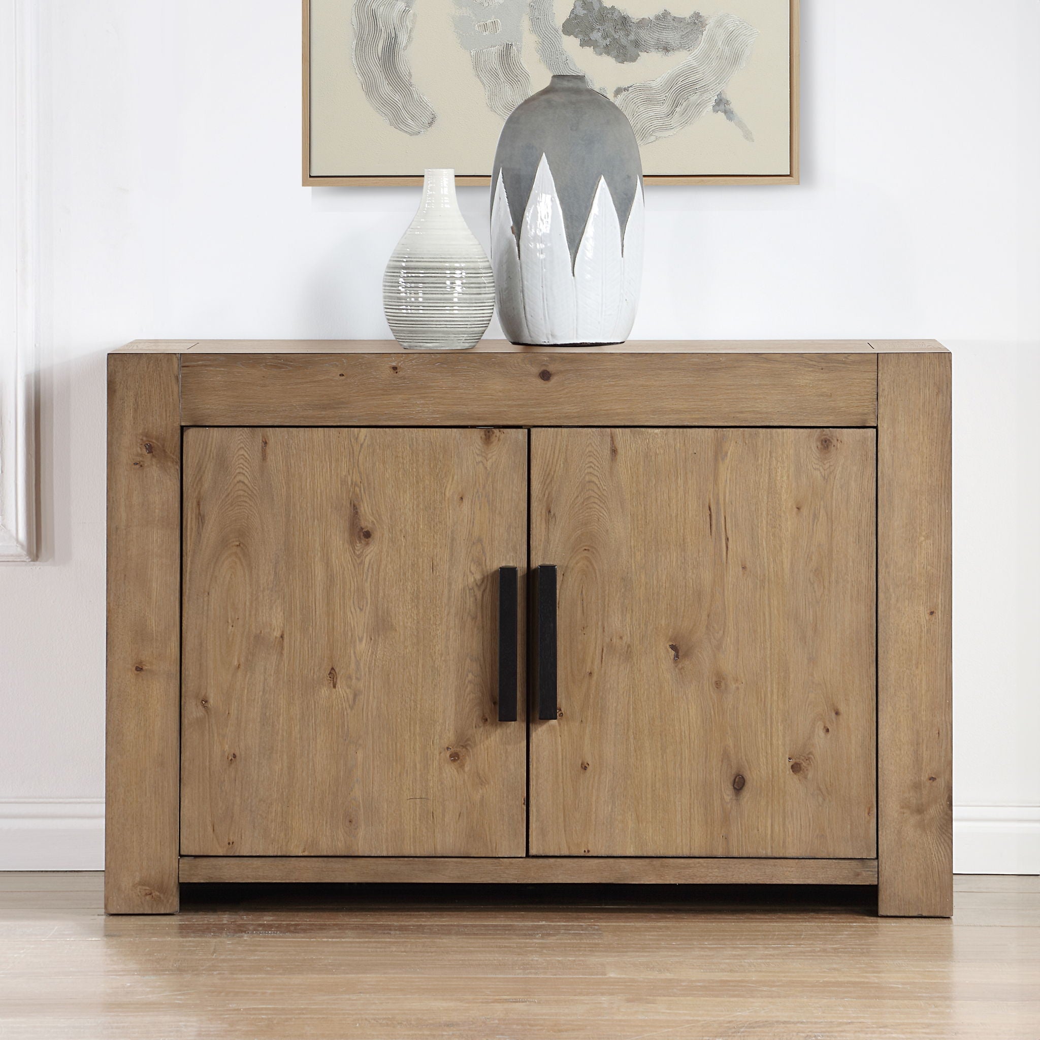 El servidor Aubrey con acabado de madera flotante ofrece amplio espacio de almacenamiento para todos sus utensilios de comedor. Con estilo artesanal, líneas limpias y proporciones robustas, irradia una estética de diseño primitivo. Dos estantes ajustables le permiten personalizar su espacio según sus necesidades, mientras que los tiradores y estantes interiores de madera en contraste facilitan su combinación con otros artículos de comedor, especialmente con los de la colección Aubrey.