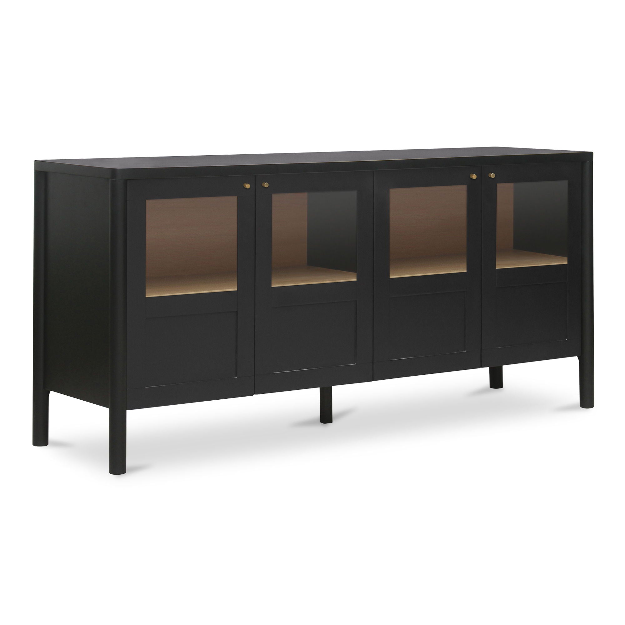 Inspired by classic cabinetry, the Hannah sideboard's thoughtful design balances transparency and concealment through artfully combined glass and solid panels. Crafted with a solid pine frame and oak veneer accents, this piece features slender dowel legs and simple bronze hardware.