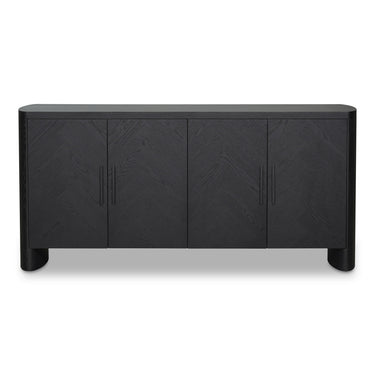The William sideboard showcases a sleek, modern silhouette with a rounded edge frame and base. A herringbone pattern embellishes its door front, adding a touch of sophistication, while the sideboard's rich black stain finish exudes a sense of maturity and timelessness. A charming parquetry pattern adorns the exterior surfaces, infusing rustic elements into any living or dining space.