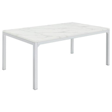 Decore su comedor con una opulencia moderna y llamativa. Esta hermosa mesa de comedor contemporánea luce una superficie lisa de mármol blanco, un diseño lujoso que sin duda impresionará. La base de la mesa está hecha de metal de primera calidad con un acabado cromado brillante que brilla con la luz. Desde cenas cotidianas hasta banquetes elaborados, la superficie rectangular ofrece todo el espacio necesario para disfrutar de una comida familiar. Rodee esta moderna mesa con sus sillas favoritas para completar un comedor formal con estilo.
