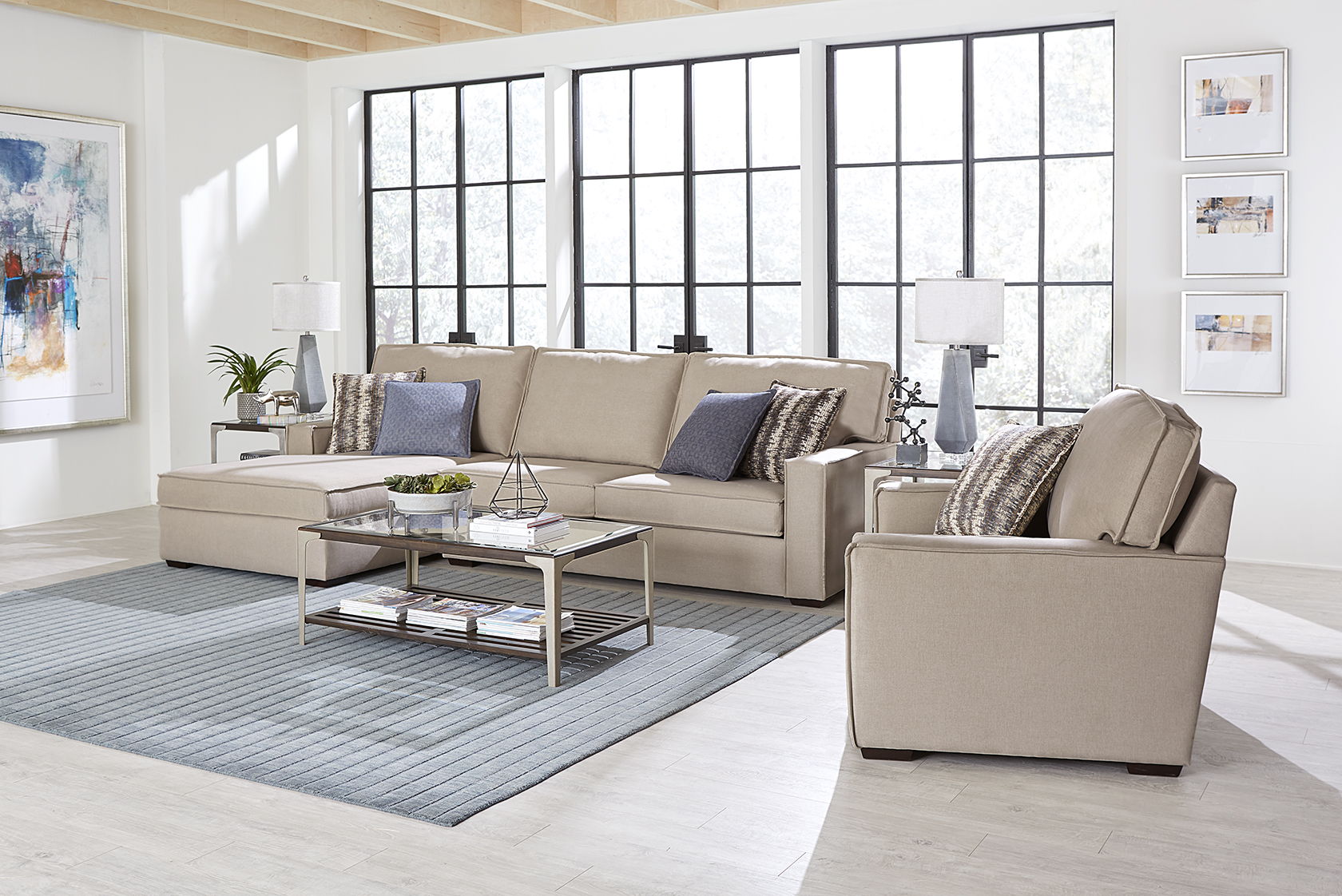Our Lyndon sectional is sure to make a statement! This overscaled casual silhouette features a flange welt, thick seat and back cushion, and unbeatable comfort. Pair the sectional with the matching chair for a total room makeover. Available in your choice of over 400 fabrics.