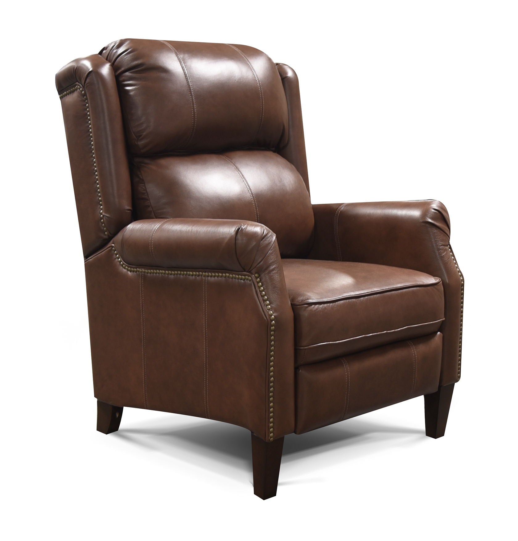 Transitional styling in luscious leather, our Kora high leg recliner offers generous comfort and makes a statement. We pull the look together with tapered wood legs, a pub back, and an optional antique brass nailhead trim. Cover it in your choice of leather to make it work for you and have it in your home in 30 days or less! Also available with a power upgrade. Take a look at Helen for the fabric version.