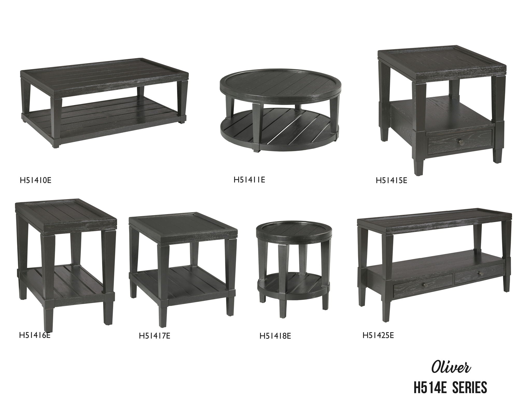 The Oliver collection includes a rectangular cocktail table, round cocktail table, rectangular end table, rectangular chairside table, round end table, and sofa table.