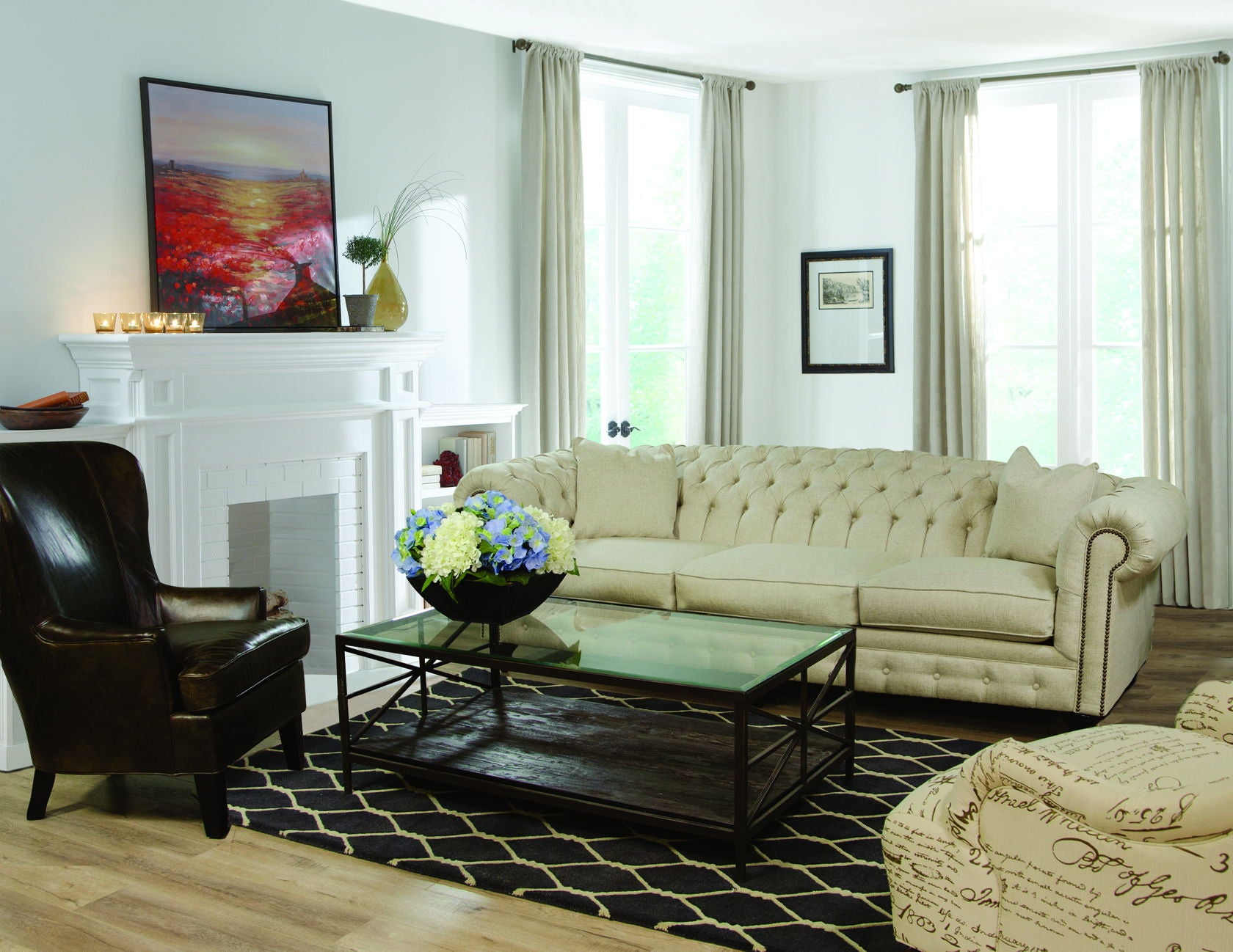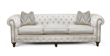 Our Rondell collection is our interpretation of the iconic English Chesterfield. This classic style features a beautifully tufted back and inside arm, simple front rail with button accents, a large rolled shelter arm accented with optional petite antique bronze nail heads, and an intricate turned wooden leg. We offer a sofa, love, chair, and ottoman covered in your choice of fabric or leather.