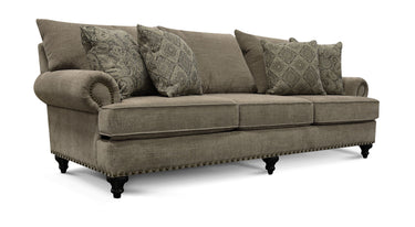Create a welcoming atmosphere in your home with England's Rosalie collection. With its generous proportions, casual rolled arm, beautiful turned leg, optional antique brass nailhead trim, and loose pillow back, you'll probably want to sit and relax for a bit! Our Rosalie series features a sofa, loveseat, chair, ottoman, and sectional. Make this style go cottage or family room with your choice of over 400 fabrics!