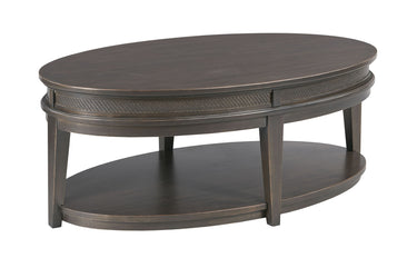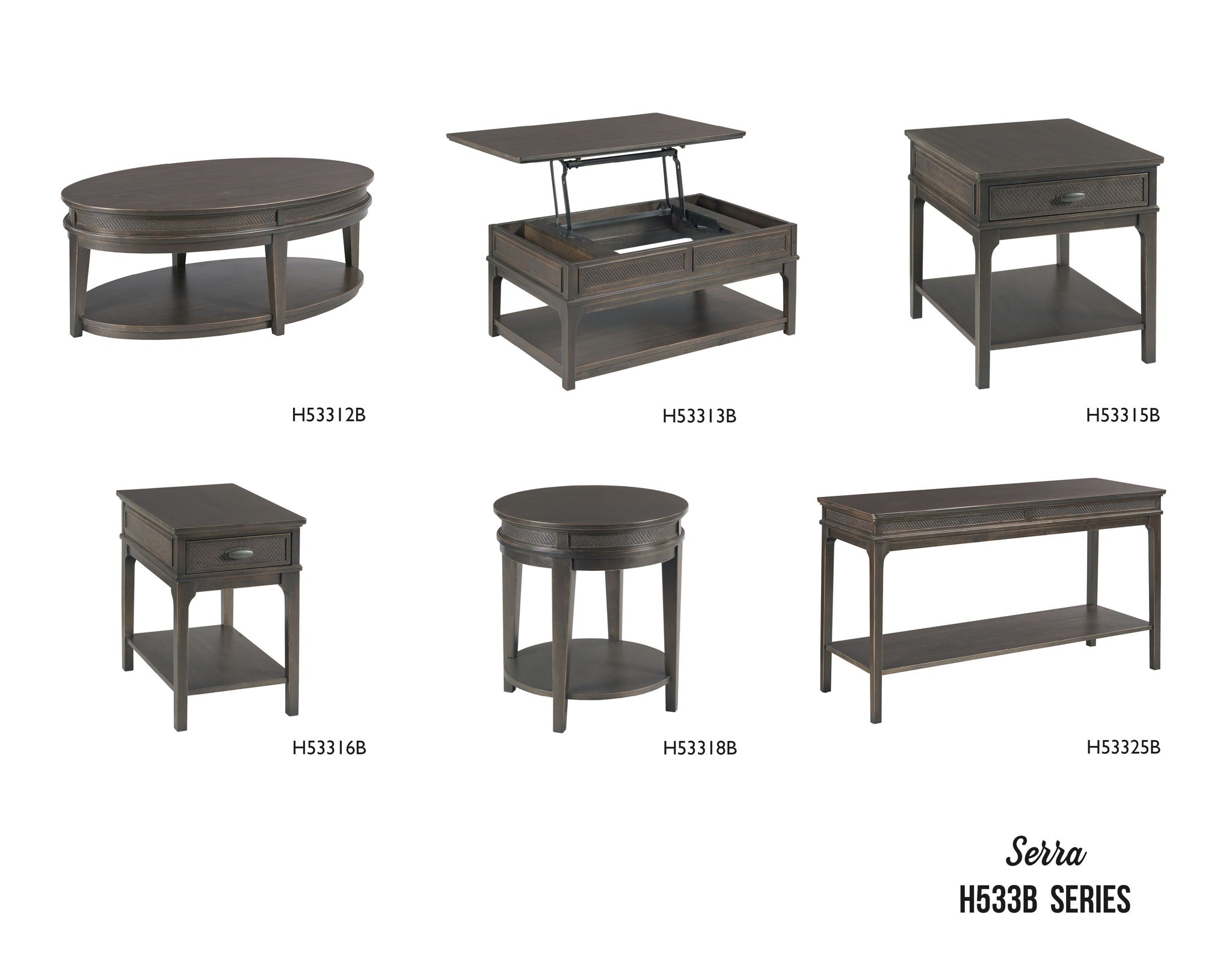The Serra collection includes a oval cocktail table, lift top rectangular cocktail table, rectangular end table, rectangular chairside table, round end table, and sofa table.