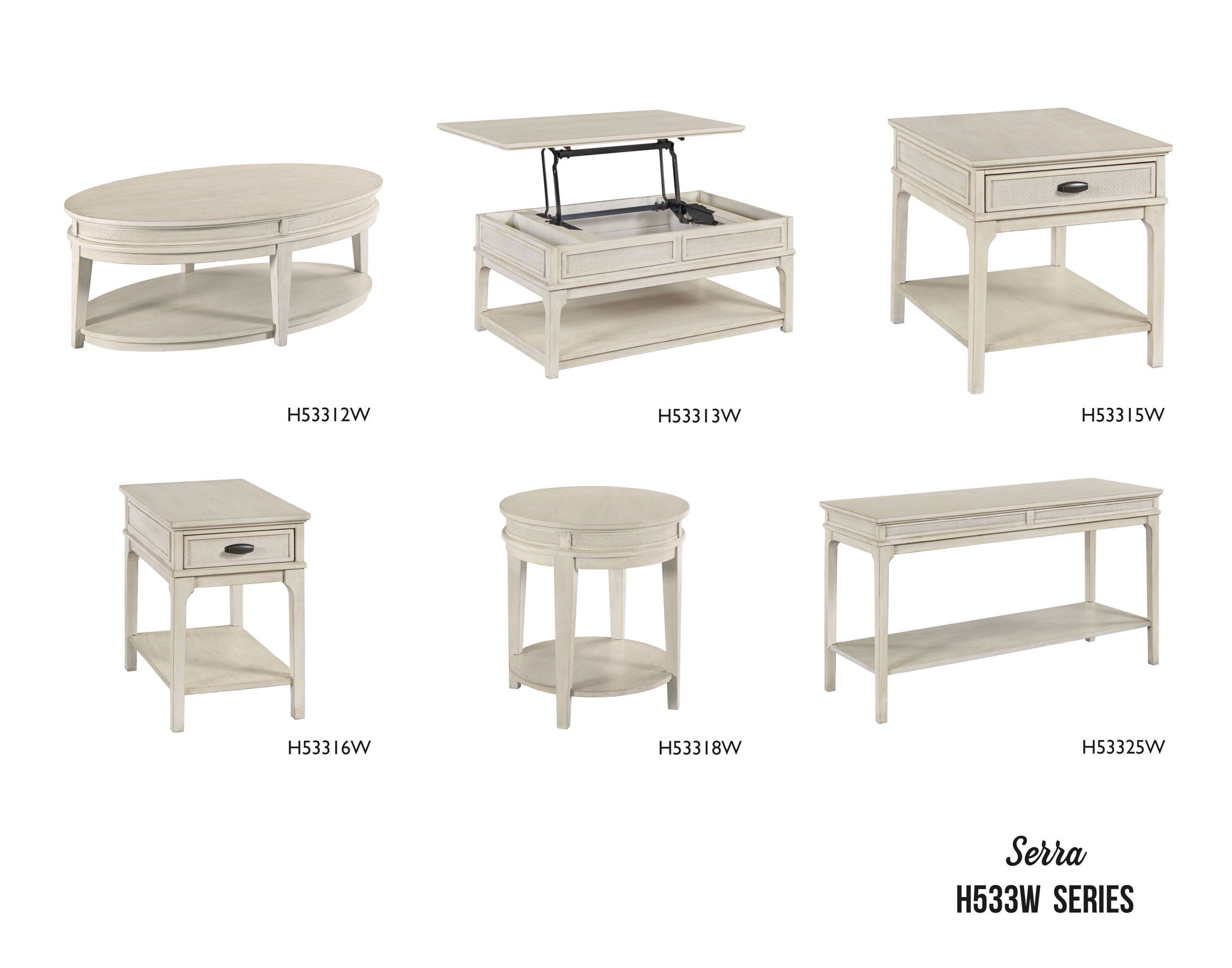 The Serra collection includes a oval cocktail table, lift top rectangular cocktail table, rectangular end table, rectangular chairside table, round end table, and sofa table.