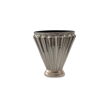 A fan favorite with scallops ready to show off. Jade turns a classic shape into a statement piece. Cast in aged pewter aluminum, its scalloped fan silhouette and Deco-inspired channeling create an eye-catching play of light and shadow. The elongated opening suits bold arrangements or holds its own just fine. Sculptural, elegant, and unapologetically ornamental, it’s a vase with presence and just a little sparkle.