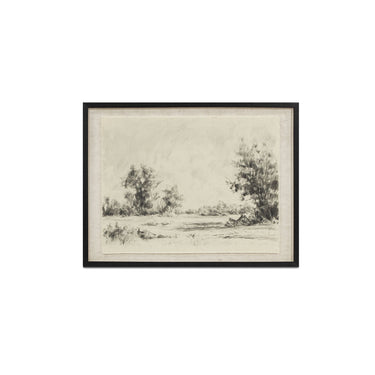 A classic, redrawn. Briar reimagines the traditional landscape with a relaxed hand. Sketched in bold strokes on soft white cotton, its countryside composition feels both familiar and freshly interpreted. Frayed edges nod to its hand-touched origins, while the solid wood frame and glass overlay lend a polished finish. Timeless, textured, and heritage with a hint of ease.
