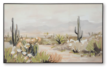 Lleva la belleza del desierto a tu hogar. Este arte mural cautivadoramente sereno exhibe un paisaje sereno, con icónicos cactus y delicadas flores. Elaborado con meticuloso detalle, este lienzo decorado a mano es la opción perfecta para quienes buscan un toque de encanto del suroeste.
