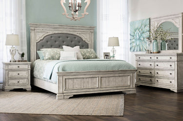 Vintage styling in a classically styled bedroom collection. Highland Park features a waxed driftwood finish complemented beautifully with a tufted fabric headboard. Storage pieces include chest, dresser, and nightstand to complete your bedroom.