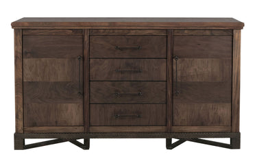 Consola de 4 cajones y 2 puertas. Esta consola está elaborada con exquisita madera de parota, de belleza atemporal y durabilidad inigualable. Perteneciente a la elegante Colección Walnut, presenta un rico tono marrón rojizo realzado por un acabado lacado translúcido de varios pasos que realza la veta natural y el carácter de la madera. La consola cuenta con cuatro cajones, dos puertas y estantes fijos, ofreciendo un amplio espacio de almacenamiento. La base texturizada añade un toque distintivo de sofisticación, realzando el diseño general. Transforme su sala de estar en un remanso de estilo y artesanía con la Colección Walnut, una combinación perfecta de arte excepcional y elegancia moderna.