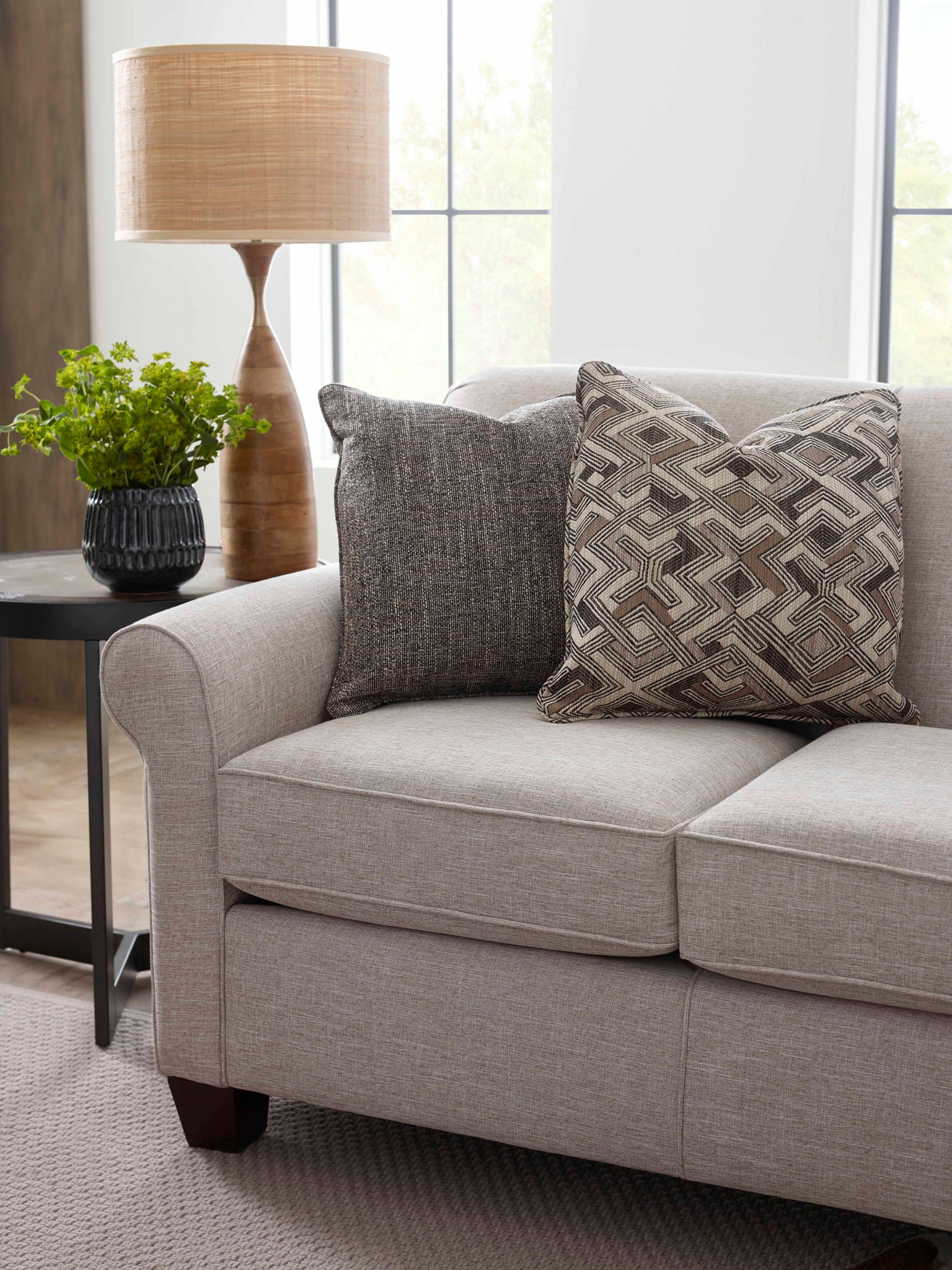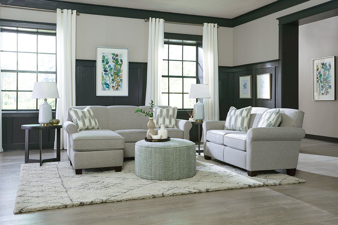 Angie can only be described one way Sleek, simple, and super comfortable. Its clean silhouette is achieved with a tight back, a P-shaped roll arm, and an exposed wood leg. This fashion-forward silhouette can go from understated and sophisticated to fabulous and fun with the change of a fabric. We offer a sofa, loveseat, chair, ottoman, floating ottoman chaise, and sectional, as well as twin, full, and queen sleepers in this collection.