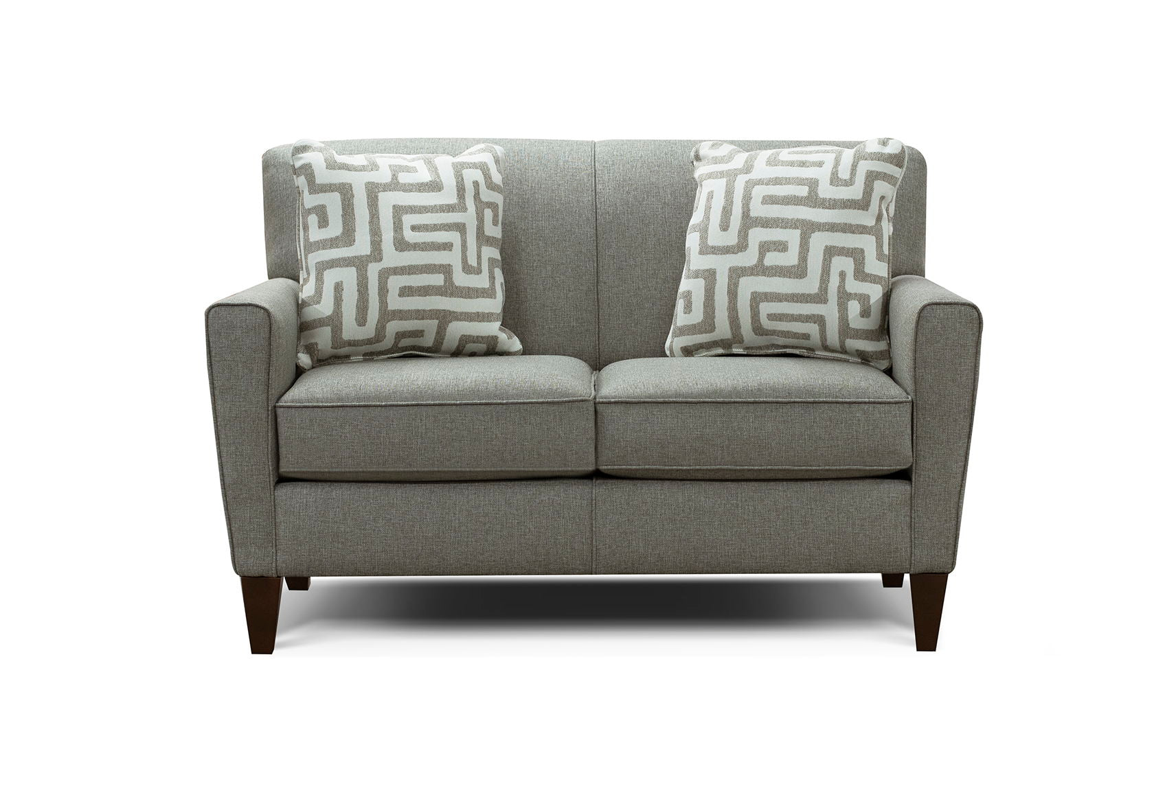 Our Collegedale leather collection's smaller scale is ideal for those short on space; however, its contemporary styling makes a big statement! The silhouette features a simple arm, high tapered leg, and contrasting pillows. The collection features a sofa, loveseat, chair, and ottoman.