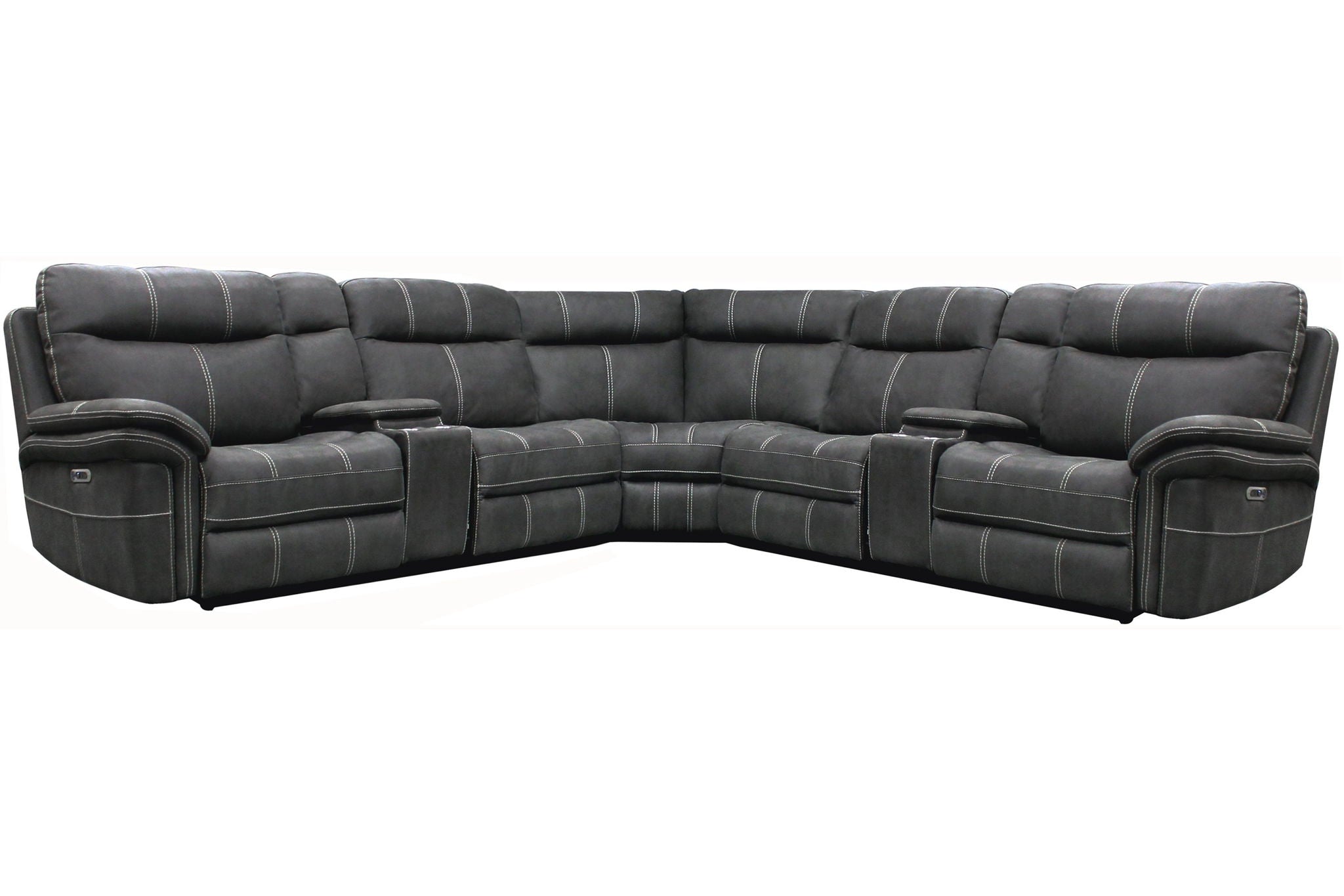 Incluso los anuncios comerciales son más llevaderos cuando te relajas en la lujosa comodidad de este conjunto de asientos seccionales. Te encantará el lujo de sus dos sillones reclinables eléctricos en cada extremo, con reposacabezas eléctricos. Entre ellos, encontrarás un sillón reclinable sin brazos, un sillón sin brazos, una cuña esquinera y una consola de almacenamiento multifuncional con portavasos.