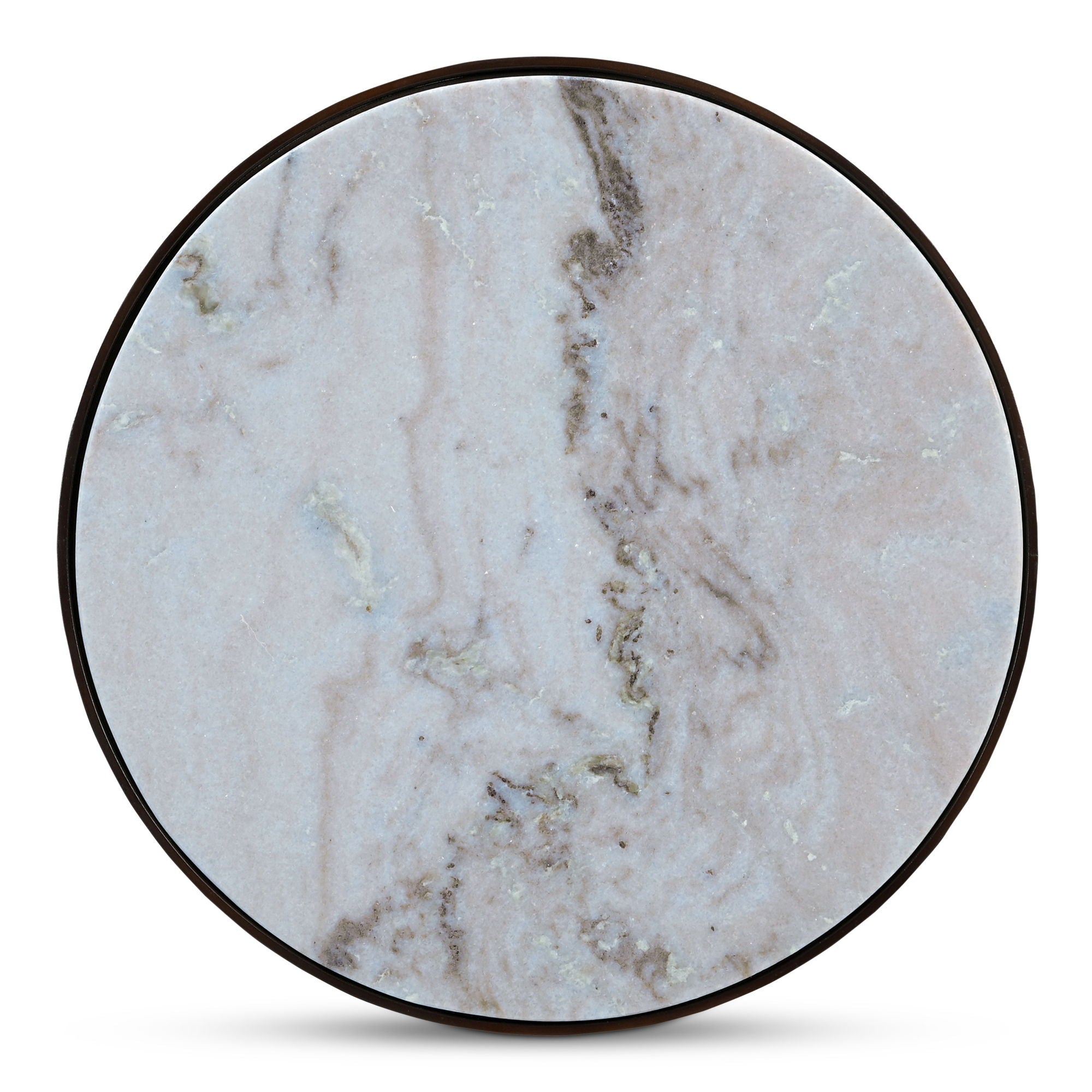 The Holli side table blends timeless white marble with sleek iron, as its expressive top rests within a subtle metal rim. The iron base, featuring gentle curves and distinctive buckle-like detail, showcases meticulous craftsmanship in classic white with bronze frame.