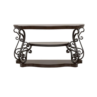 Esta elegante consola, también conocida como mesa de sofá, combina a la perfección estilo y funcionalidad. Su acabado en madera merlot oscura realza la construcción de madera de ingeniería y chapa de cerezo, mientras que las ornamentadas volutas de las patas metálicas con recubrimiento en polvo de bronce oscuro realzan su encanto atemporal. Los estantes central e inferior de madera pulida ofrecen espacio adicional de almacenamiento o exhibición. Perfecta para realzar pasillos, salas de estar o detrás de sofás con un toque clásico y sofisticado.