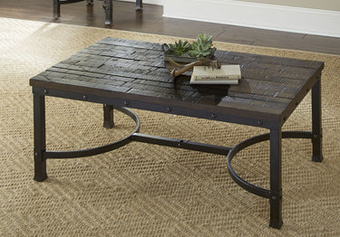 The Ambrose collection features a butcher block style wood surface that gives an aged and antiqued look. The rustic styling is accentuated by the dark iron legs and Demilune stretchers that connect in the middle. The distressed finish of the Ambrose cocktail table will easily blend with existing décor. Available for purchase separately is the matching end table. Your purchase includes one cocktail table.