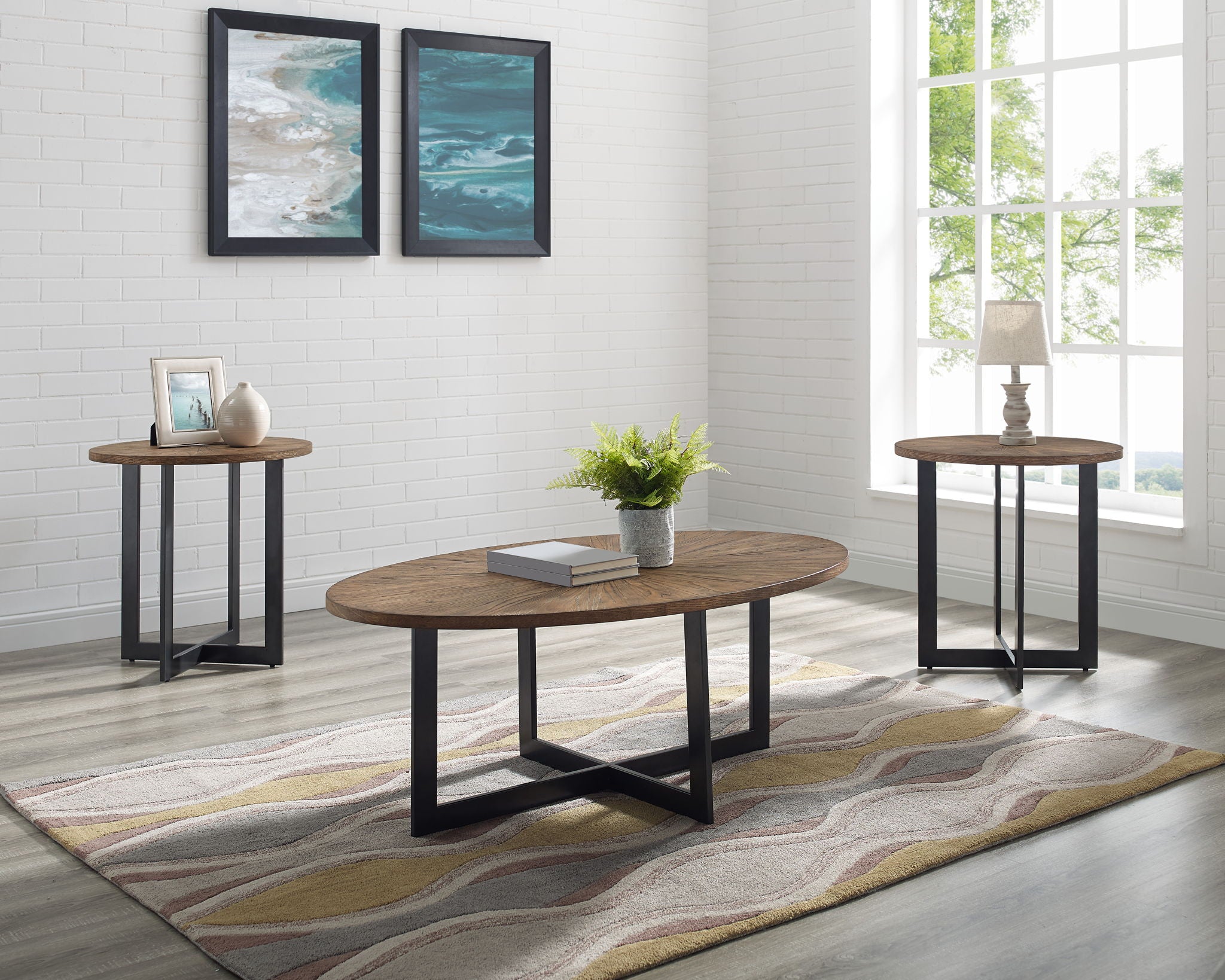 Mixed media occasional set features transitional styling with sunburst ash veneer top and iron base. The pecan color top finish is burnished to match beautifully with the black iron base and is sure to complement any living room setting.