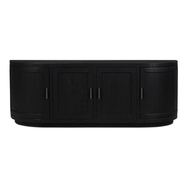 A blend of modern and vintage with its contemporary silhouette, the Nicola media cabinet features curved doors that smooth the bold textures of reclaimed wood. Its striking form stands on a recessed base, offering a stark contrast that beautifully complements transitional settings. The minimalist handle detail emphasizes the piece's elegant curves, while ample storage simplifies the organization of media essentials inside.