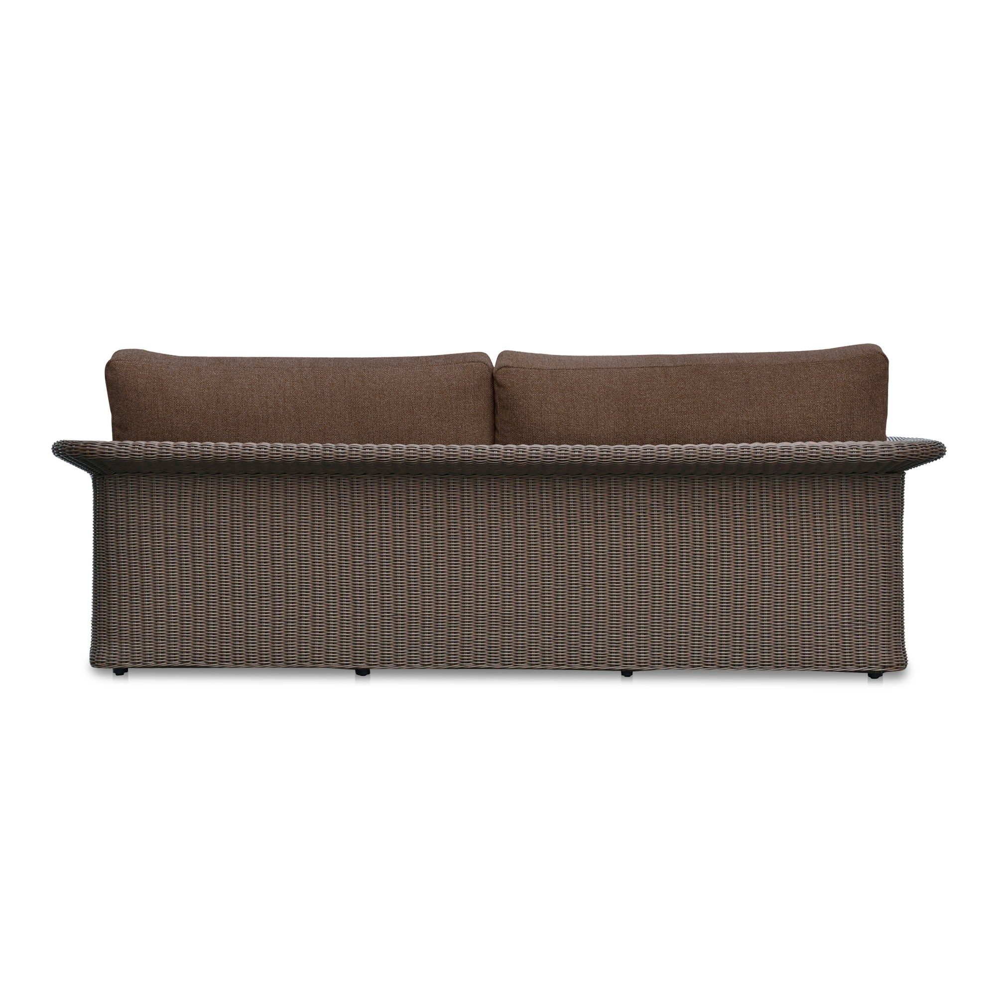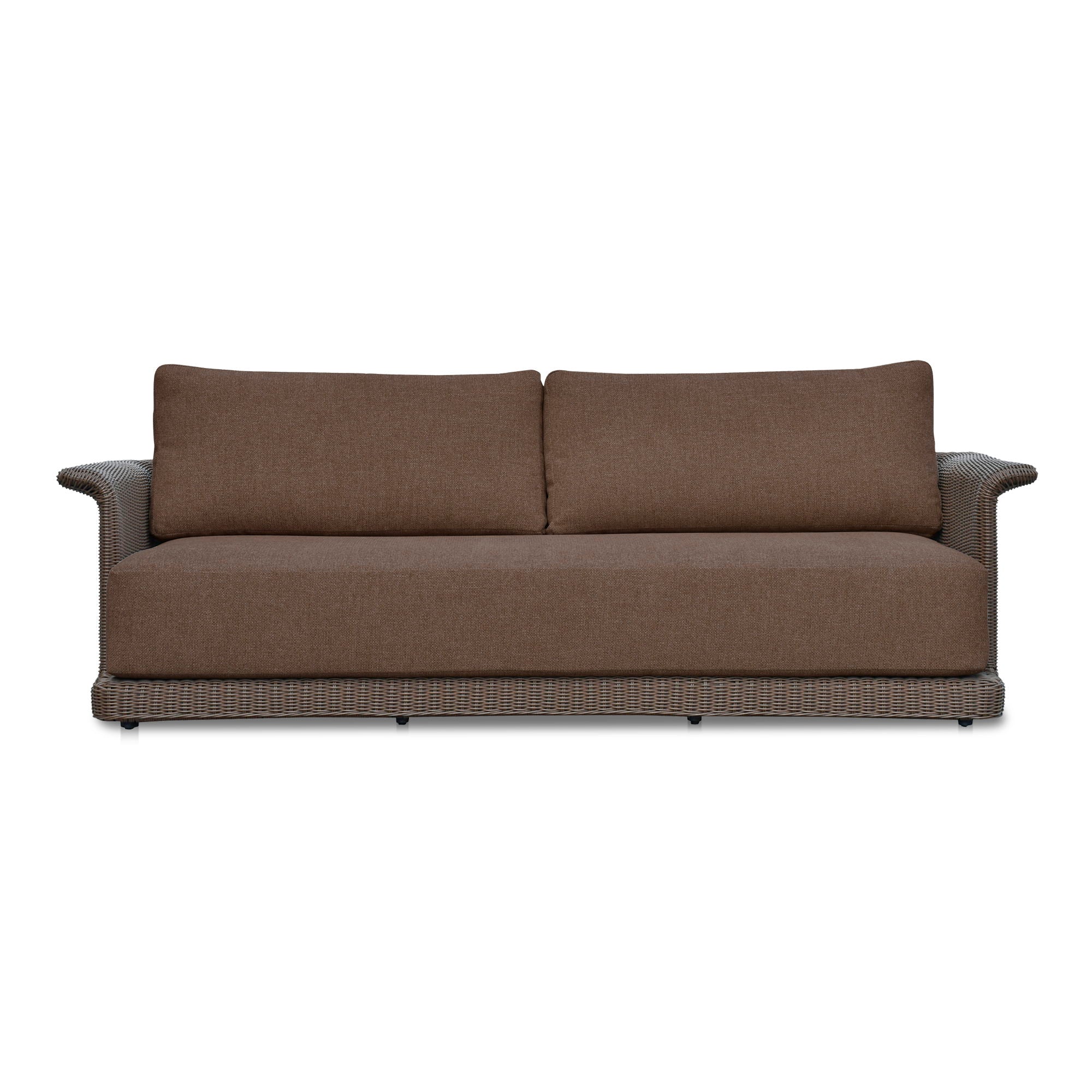 The Meredith sofa's graceful tulip silhouette and curved armrests create visual interest, while generous cushioning offers indulgent comfort. Artfully woven synthetic wicker over an aluminum frame marries durability with aesthetic appeal. Quick-dry foam and Dacron fiber ensure lasting resilience, while the sophisticated hue complements various exterior designs.