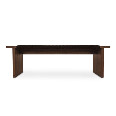 The Merritt outdoor bench blends indoor refinement with outdoor durability. This versatile bench features a solid teak frame complemented by woven, twisted synthetic hyacinth. The dark brown finish adds a touch of sophistication to any setting. Suitable for both outdoor use and as an entryway bench, it provides stylish seating and a subtle textural element to elevate any space.