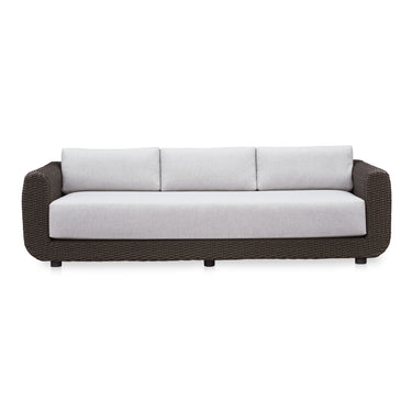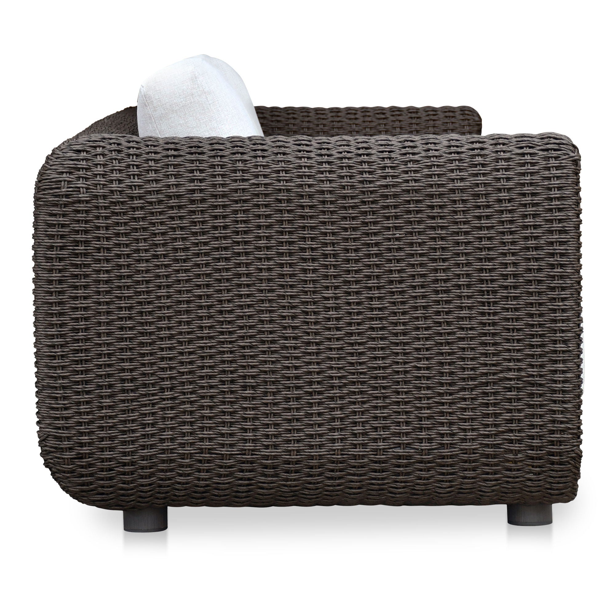 The Soma outdoor sofa finds a graceful interplay of form and purpose. Its dark brown finished PE synthetic wicker frame and sunproof, heathered Olefin fabric cushions exude poise and durability. Curved, playful arms and quick-dry foam invite relaxation while ensuring timeless panache.