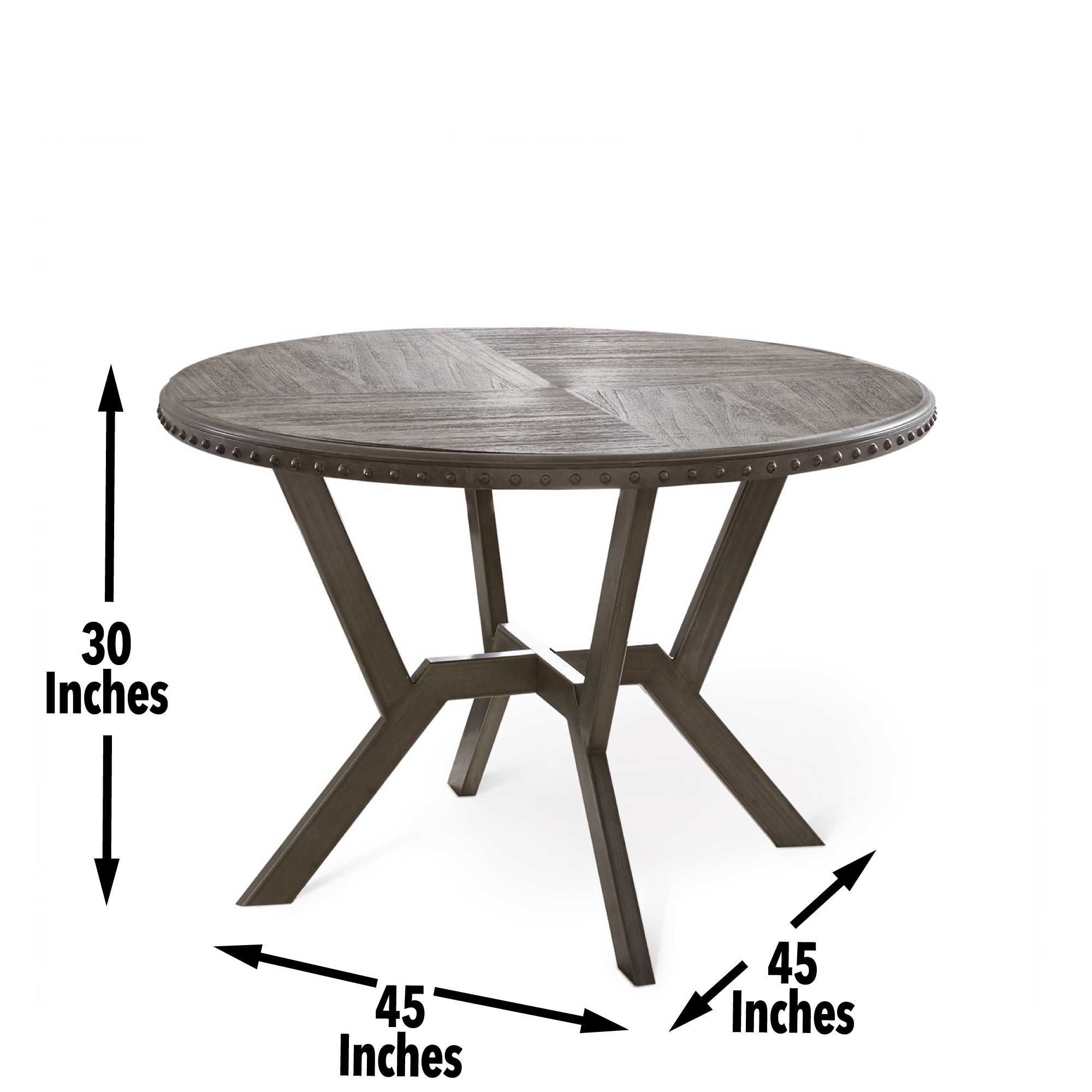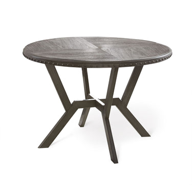 Mixed media and geometric designs combine in a soft gray palette for the Alamo Dining Collection. The Alamo Dining Table is constructed of paulownia veneers in a gray finish with a gray metal base with black hand brush accents. The table features a round parquet veneer top with a decorative metal rim accented by the unique geometric metal base. Add the matching Alamo dining chairs (purchase separately) to create interest for your dining space. Your purchase includes one dining table.