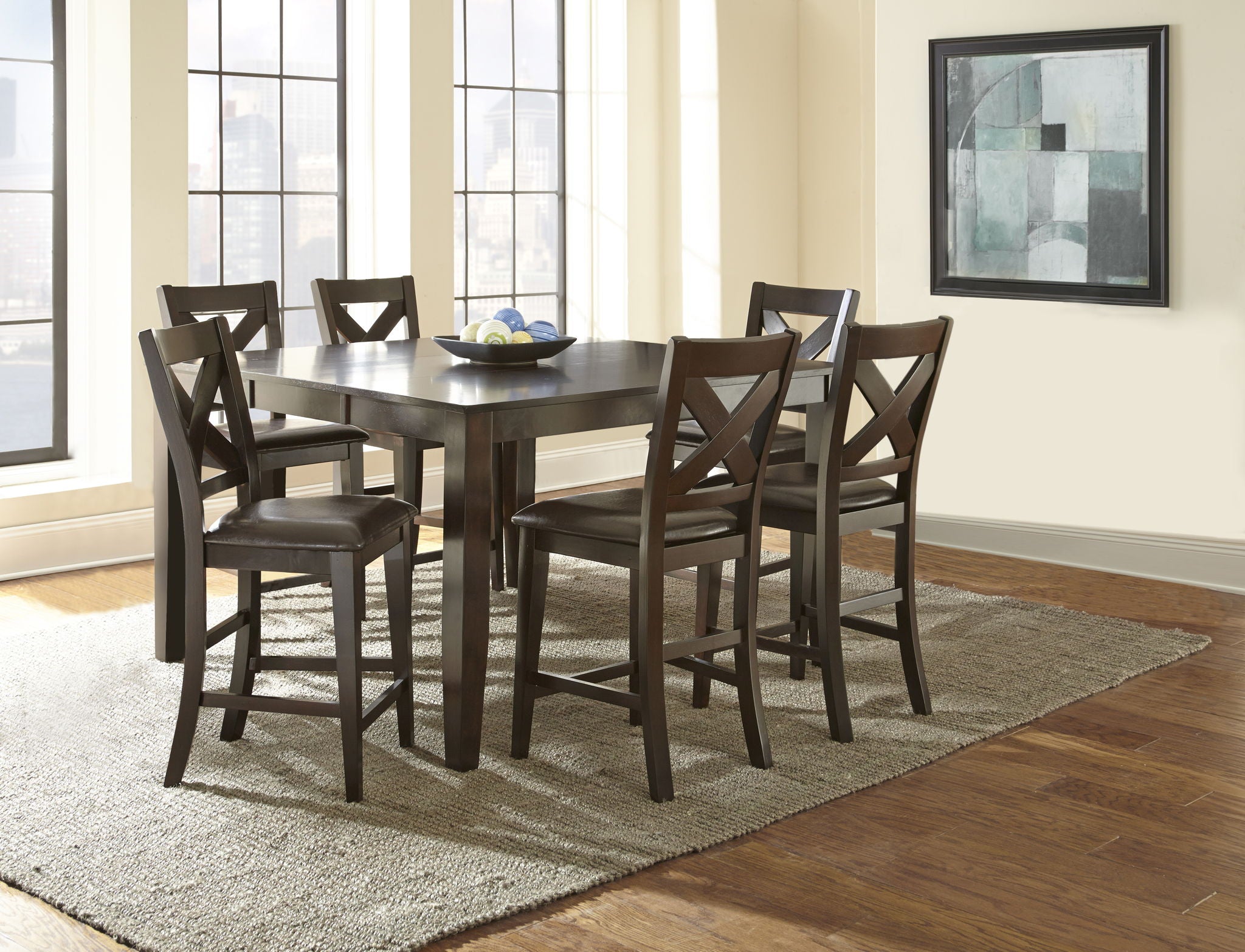Mango solids and veneers combine with a warm espresso finish in this Crosspointe Counter Dining set from Steve Silver Company. The table features rustic styling with a signature "X" styled back that gives the collection a transitional feel. The 42" rectangular table converts to a 60" square that seats eight with the addition of the uber-convenient 18" self-storing butterfly leaf.