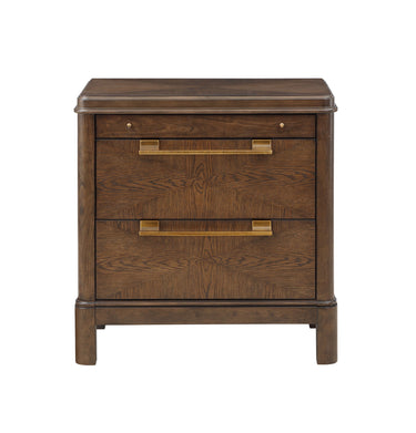 Modern style in a warm brown walnut finish, the Milan Nightstand will make a trusty bedside companion. This piece packs a lot of design in a small footprint with sunburst veneer fronts, a reverse ogee top, and a handy pull-out shelf for glasses or beverage storage. The antique bronze hardware adds additional warmth to this updated take on contemporary design.