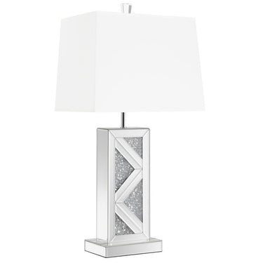 Esta llamativa lámpara de mesa presenta una base rectangular adornada con paneles de espejo y un audaz diseño de chevrones con incrustaciones de acrílico cristal triturado. Una nítida pantalla blanca equilibra la base brillante con una silueta limpia y estructurada. Los acentos geométricos y las superficies reflectantes crean un punto focal impactante para salas de estar, dormitorios o entradas. Diseñada para deslumbrar, esta lámpara añade iluminación ambiental con un toque de sofisticación inspirado en el glamour.
