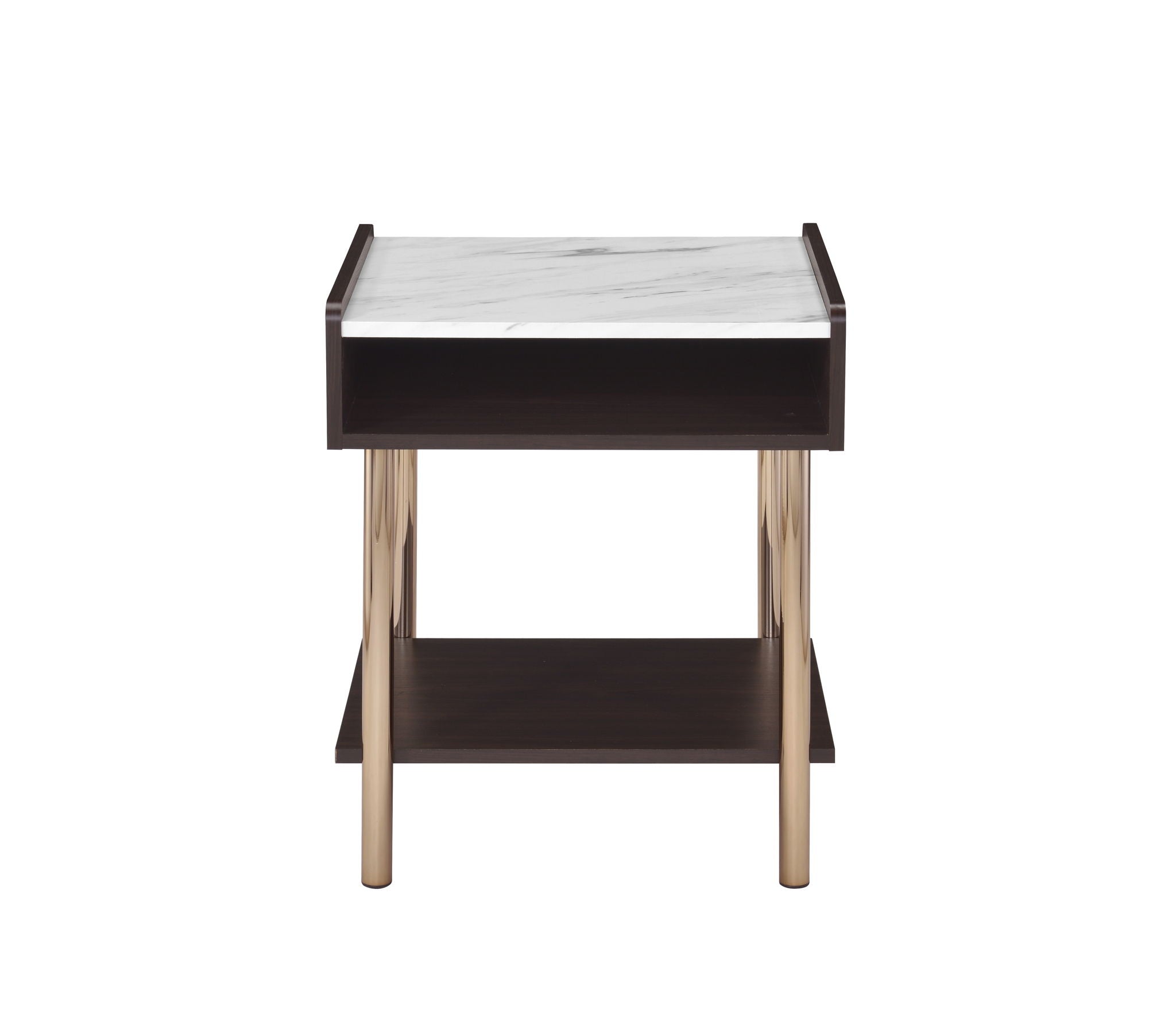 Enjoy the look of practical elegance with this classically styled End Table. Faux marble and faux walnut tops combine in Mid-Century Modern style for a Side Table that looks great in a Living Room or Bedroom as a Nightstand. Open storage offer a great place for remotes or other items while looking really sharp.