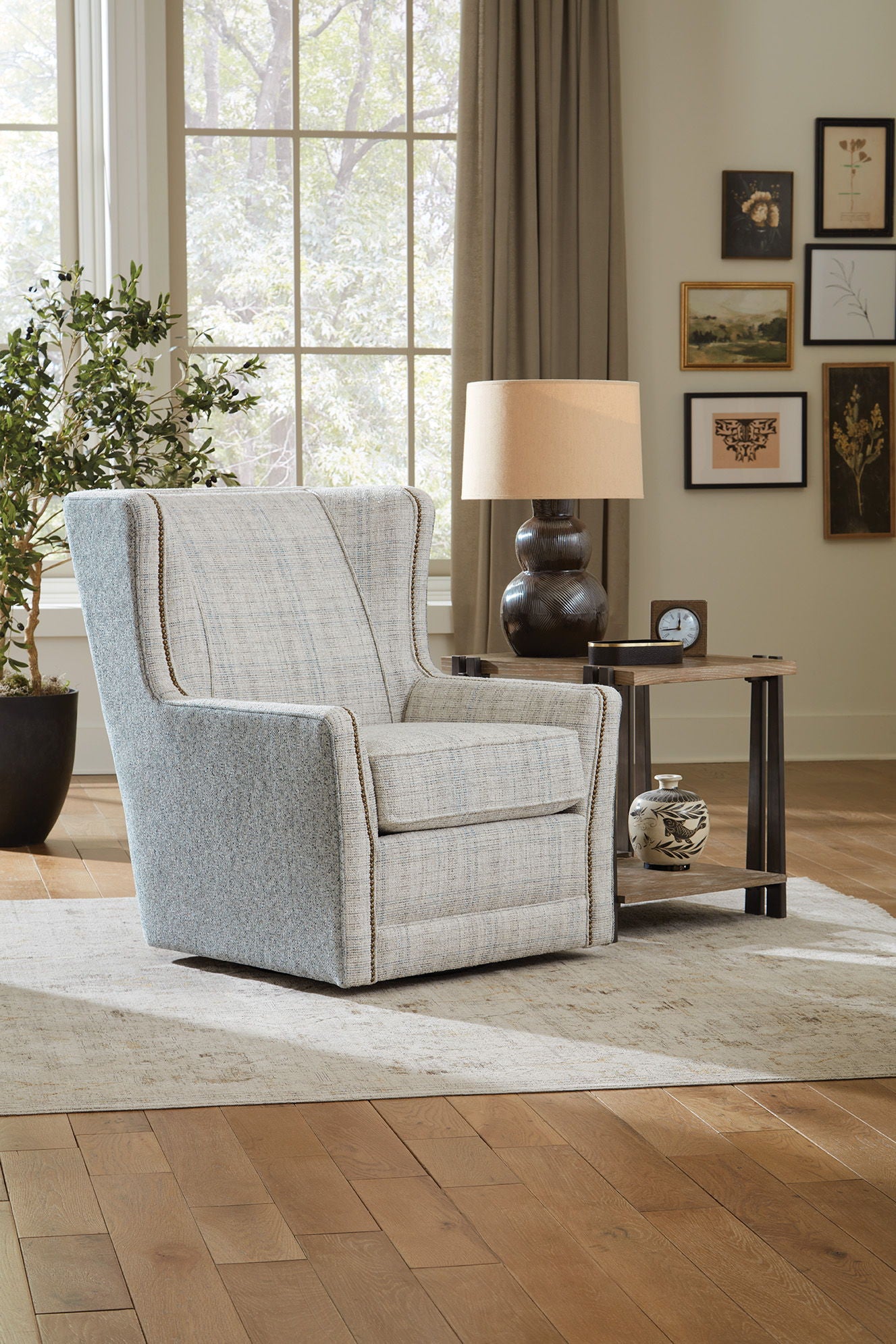 The style and supreme comfort of our Willow swivel chair is unbeatable. Truly. This unique wing chair silhouette boasts an optional nail head trim and super plush seat. Add some pizazz with the two-tone version, or keep it simple with one pattern.