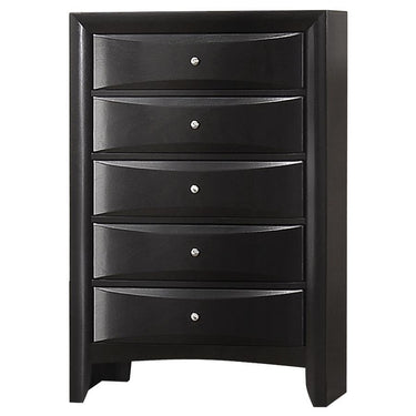 A distinctive member of the Briana collection is this solid and gorgeous chest of drawers. It is crafted from tropical hardwood and Asian veneer for durability. Chest is highlighted with chambered trim and five spacious drawers with brushed chrome knobs. Further appeal is found in the chambered drawer fronts that catch the light just so. Finished in elegant black.