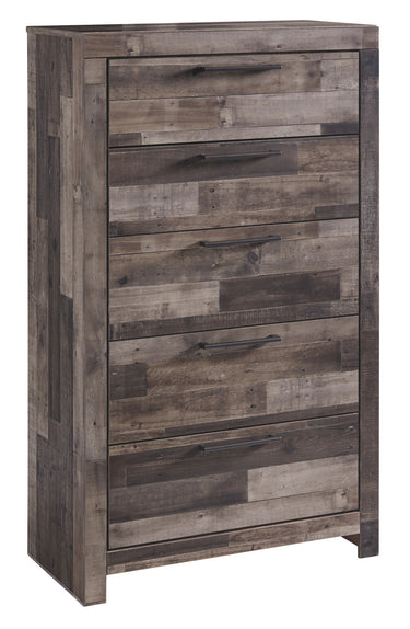 Modern yet hefty. This chest of drawers makes an urban eclectic statement. Seasoned raw wood look merges with the clean lined design we love today. Muted rustic finish over replicated pine grain maintains its authenticity. Roomy drawers are flanked with attractive framed front and pilasters. Handles with antiqued gunmetal finish complete this beauteous look with easy to pull function.