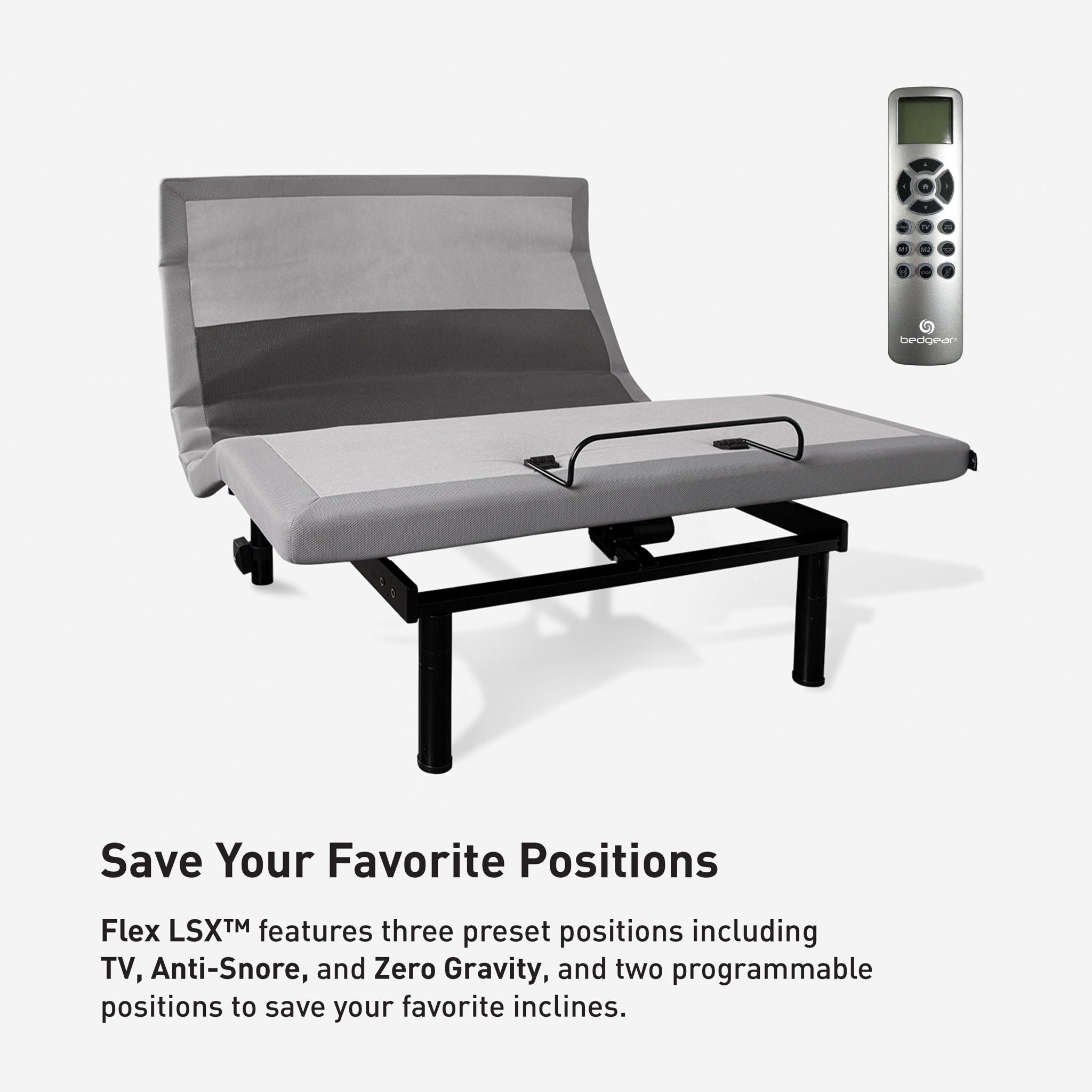 Be all about this base! Compatible with any bed frame, our Flex LSX™ adjustable base is our most advanced option. With amazing features like a wireless remote, USB charging ports, preset position, programmable memory positions, underbed sensor and mood lighting, dual massage, Bluetooth audio system, and the ability to adjust for head, neck, foot, and lumbar support, the Flex LSX is designed with you and sleep needs in mind. Get better sleep for better performance with our unbeatable adjustable base.